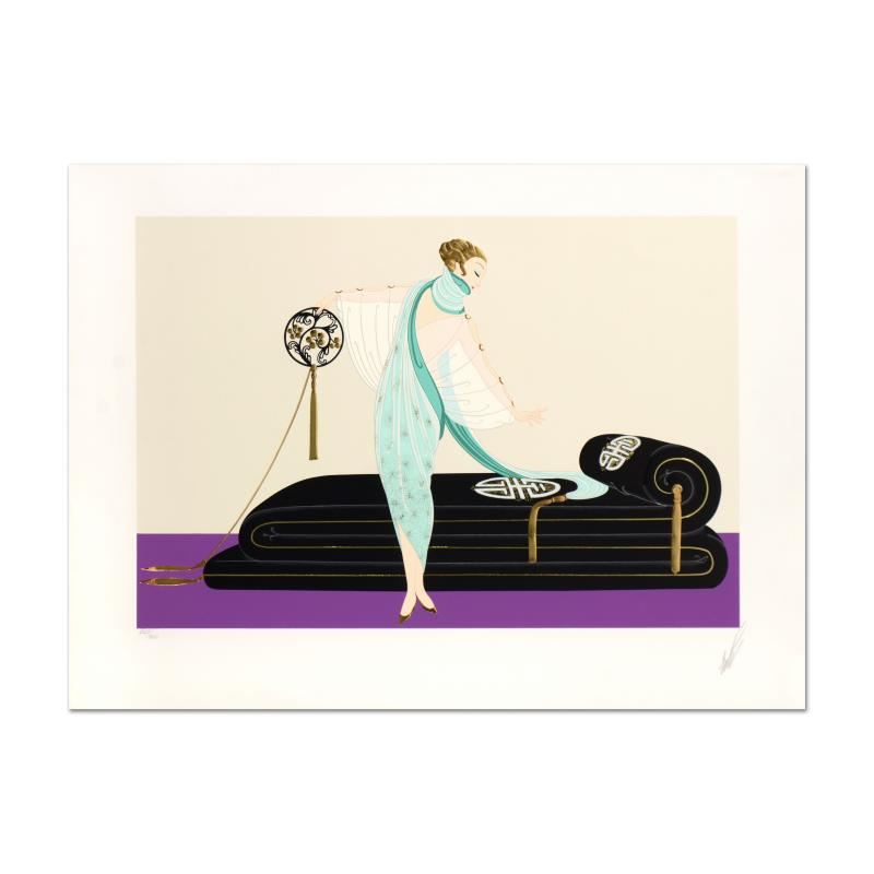 "Salon" is a limited edition embossed serigraph on paper by Erte (1892-1990), numbered and hand signed by the artist. Includes Certificate of Authenticity. Measures approx. 30" x 21.5" (with border), 24" x 18" (image). There is a minor crease on the top-right corner of the white border area that may be concealed when framed.