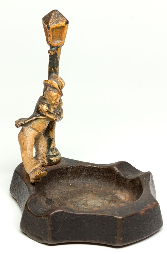 Vintage ashtray with drunkard leaning on the lamppost . Made from metal, it stands about 5" and the paint is faded. -61022