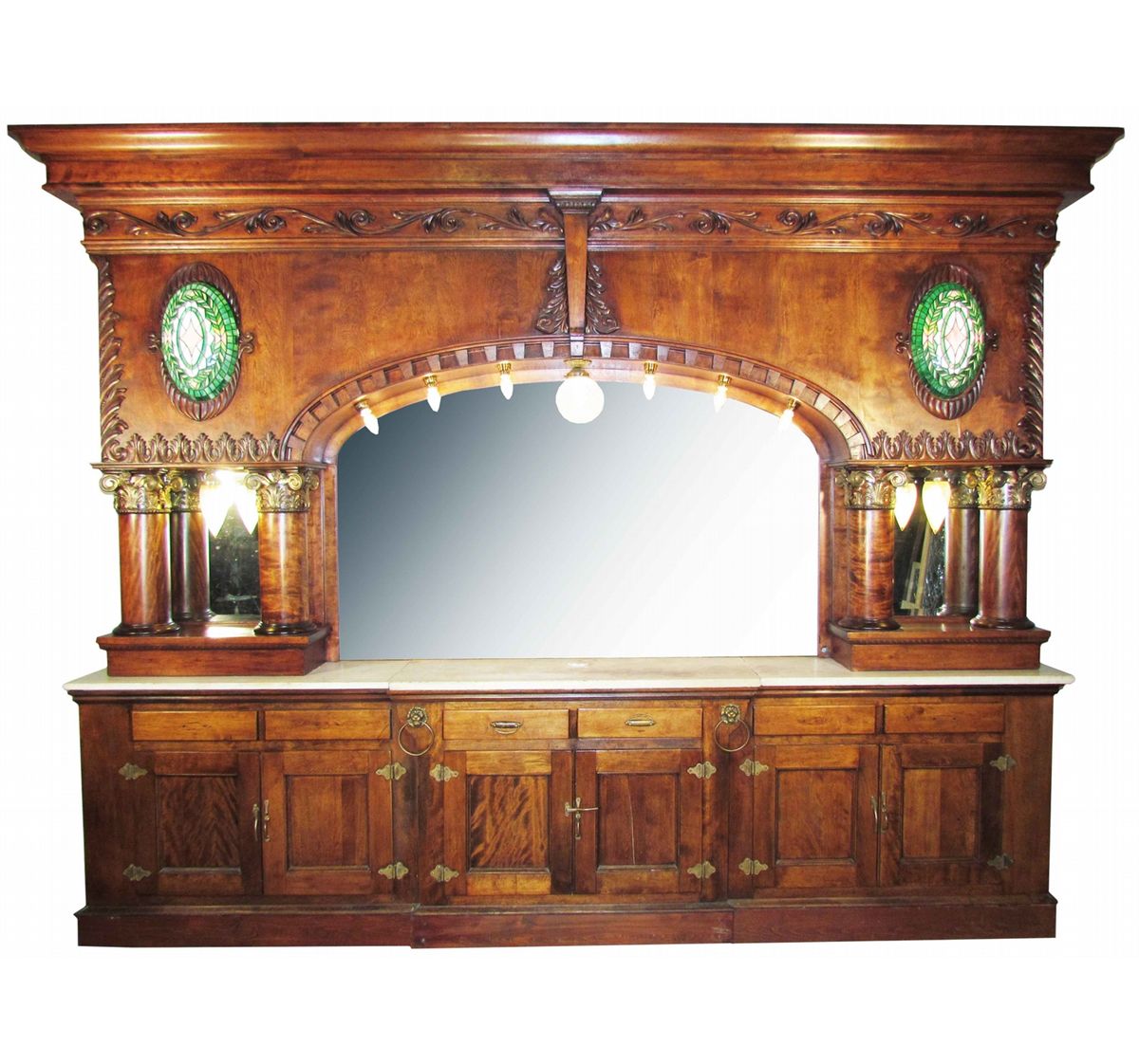 Saloon Back Bar. Four fancy columns with cast iron trim. High relief applied trim, beveled mirrors, marble top. Slag glass cameos on each and original lights. Overall good condition. 12'6" X 116 1/2 X 18 inches.