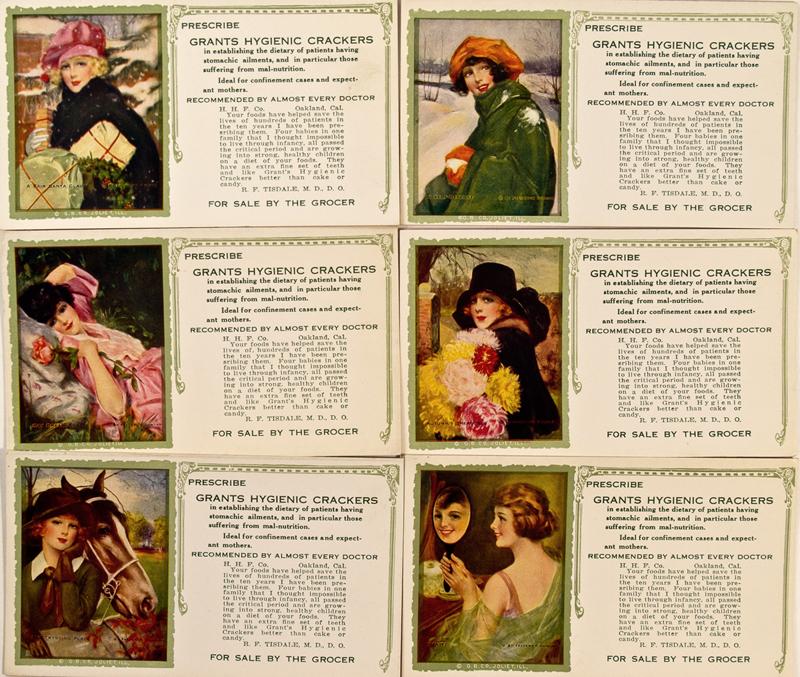 Lot of six. Saloon gals chromo lithographs cards used as ink blotters. Various poses, all advertising Grants Hygienic Crackers.