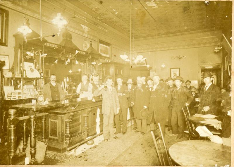 Large demijohn in wicker on floor at left. Many distinguished gentlemen at bar. Lots of advertising but only Gambrinus Brewing Company legible. Measures 4" X 5.5" on cabinet card mount. Some wear to the surface of the photo. Contrast is fair. Condition good only.