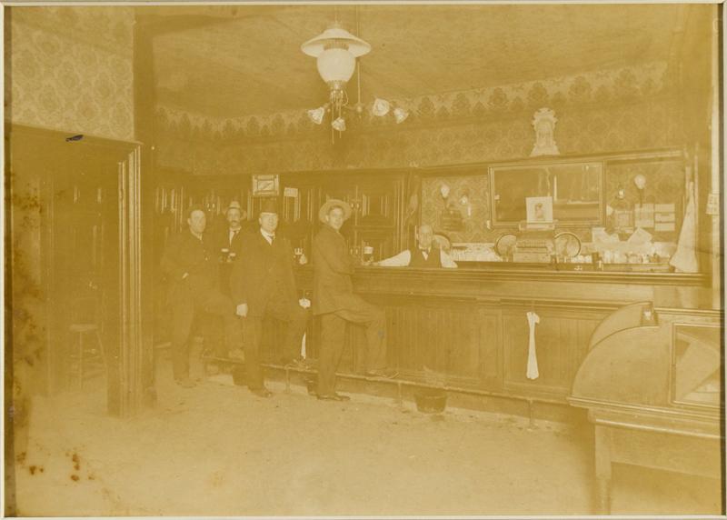 Sign for Winter Brew by Buffalo Brewing can be seen, as well as Sunnybrook Pure Whiskey. Three beer trays are visible on the back bar. Approximately 5.5" X 7.5" with a modern matte on top. Water damage at left, not affecting the central part of the saloon photo. Medium focus. Fair contrast.