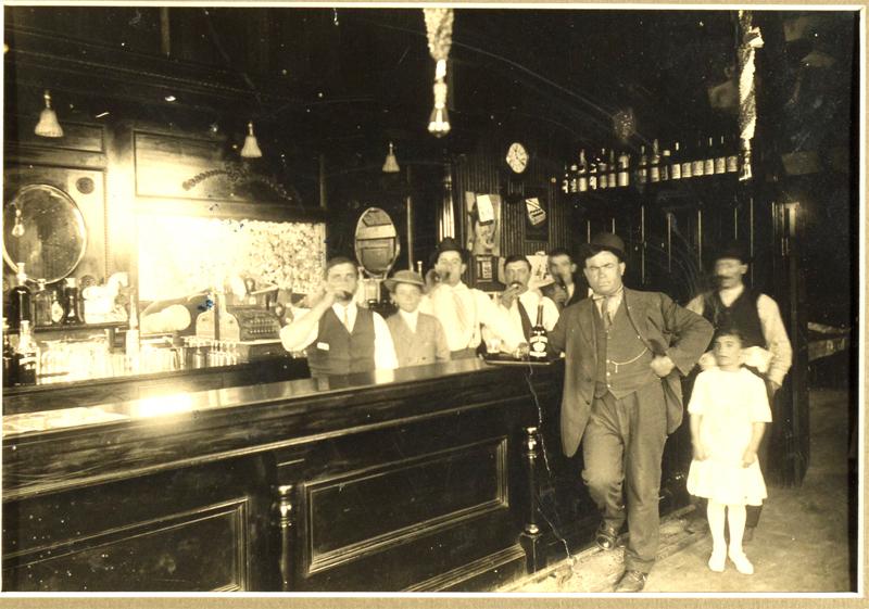 Bottle if Sunnybrook Whiskey visible on the bar. A well dressed girl of about 7-years stands at right next to one of the bar patrons. Several other patrons stand nearby and a woman stands next to the bartender behind the bar. Gilt Edge Whiskey also visible. Measures 5" X 7" with 6" X 8" new matte on top. Original matte trimmed. Center of photo has crease. Excellent contrast.