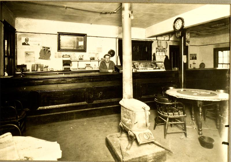 Poker table with chips and cards appears in the photo. The back bar of this saloon, if it ever existed, was removed. The only things they are selling now are cigars and tobacco. Calendar from Ohio State Insurance Company of California is hanging on wall. Measures approximately 6.5" X 4.5" on 7.5" X 10" matte. Excellent focus and contrast. Some staining on matte only.