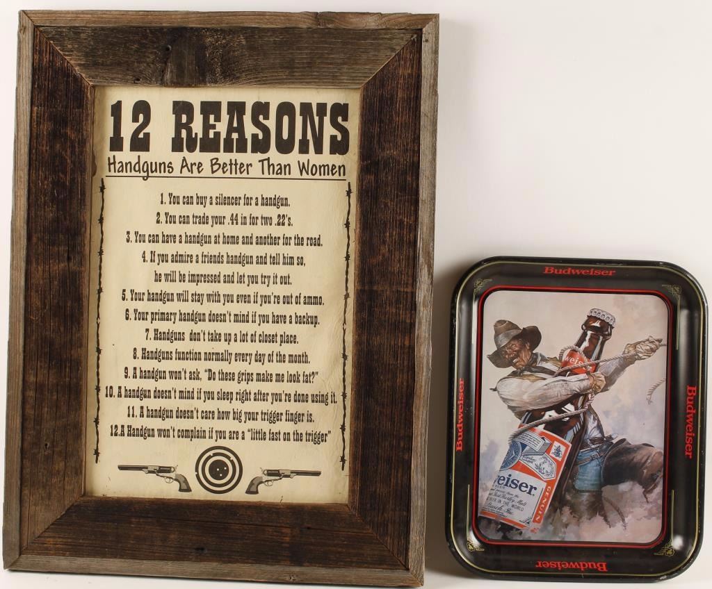 Budweiser advertiser tray depicts cowboy roping a bottle of beer and a rustic wood framed "12 Reasons Handguns are Better than Women." Framed size 17"x23". Great decorator pieces.
