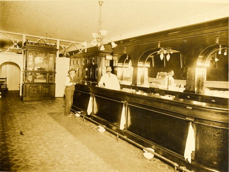 Great interior saloon photograph with one old timer standing at the bar and an excellent shot of a M. Welte & Sohn Coin Pipe Organ. M. Welte & Söhne originated in Germany in the 1830s, but the son opened a sales office in New York City in 1906 and a factory in Poughkeepsie in 1913. The company manufactured flute clocks and barrel orchestrators (early years), roll-operated orchestrions (c1887-1920s), pipe organs (1900-WWII; mostly between 1913-1929), reproducing pianos (1904-1929). They also marketed a few fairground organs and coin pianos. Welte & Sohn has been termed "one of the world's most important automatic musical manufacturing companies". Photograph measures 8.75" X 6.5" and is mounted on grey cardstock. The image is excellent quality with clear focus and contrast. Slightly yellowed. Good condition.