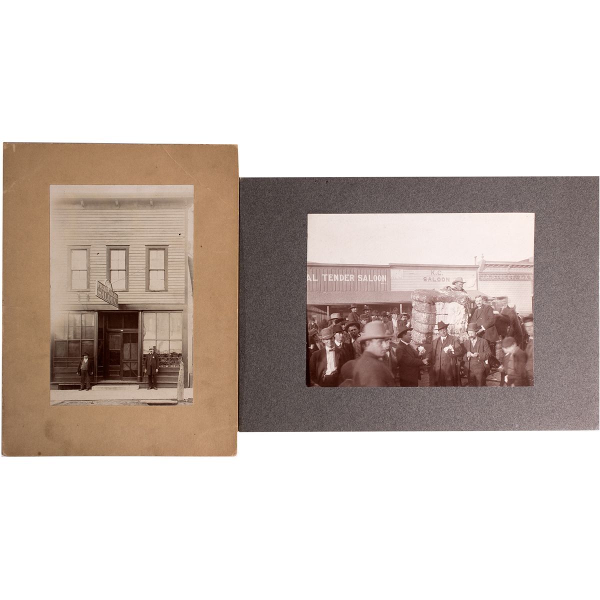 Lot of 2. 1) Montana: A man (possibly Frank Adler b.1859, d.1938) and the town marshal or sheriff posing outside of the Frank Adler Saloon. Adler lived in Roundup but spent most of his life in Anaconda. The bar operated in the eastern part of Anaconda [findagrave.com]. Photo measures 4" x 6" and is mounted on brown board (6.5" x 8.5".) 2) Possibly La Luz, New Mexico: Photograph of men out front of the (Leg)al Tender and K.C. Saloon. Most are in hats and jackets. Photo measures 6.25" x 4.75" and is mounted to a gray board (10" x 7".) - Vinegar Collection