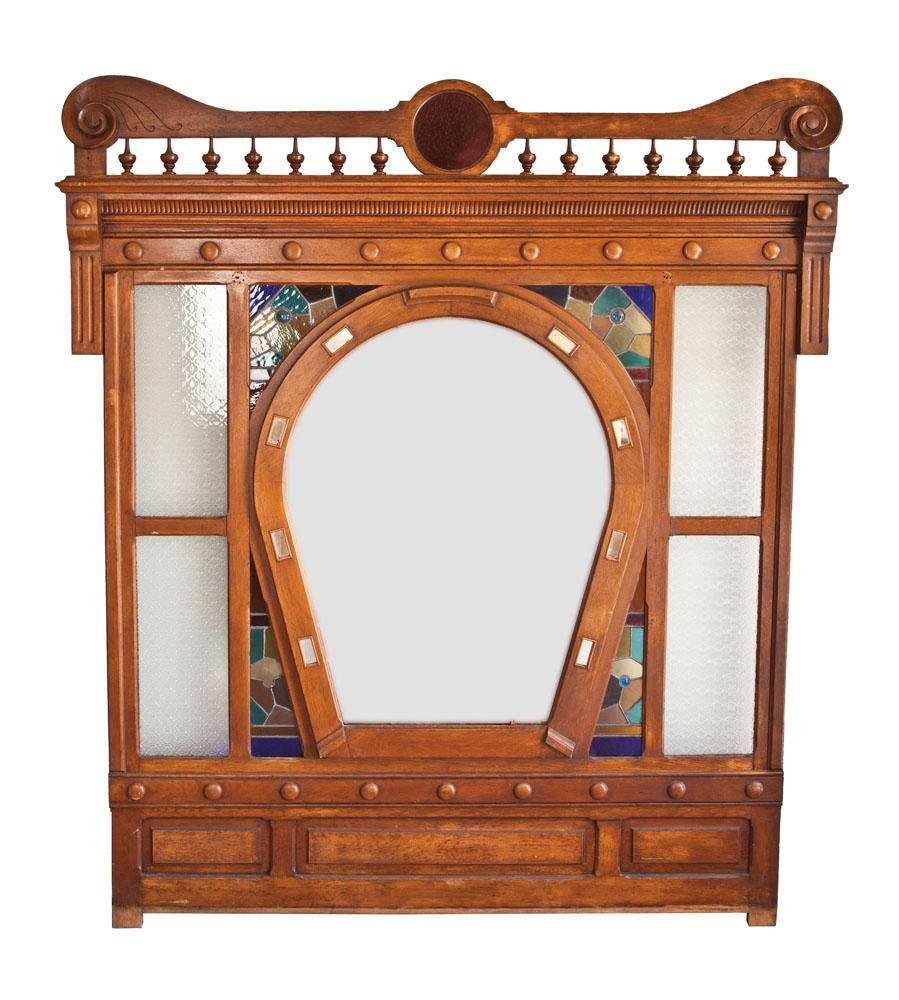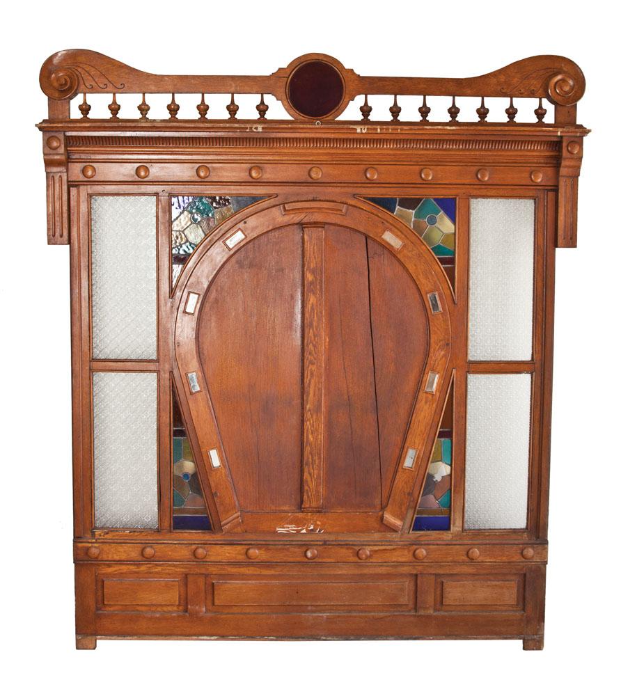 Wall unit most likely used in a high end saloon or hotel at the entry or exit to give privacy upon arrival. 6’ wide by 7’ tall with stained glass surrounding a central horseshoe, one side a 31” wide mirror, the other, solid oak panel. Frosted sidelights on each edge, removable top plate with spindle and scroll design. The horseshoe nail holes are small separate mirror inserts. Victorian style and classic saloon feel. One small piece of stained glass missing, oak panel cracked otherwise very good.