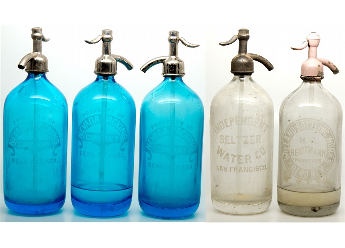 1) Three 11.5” tall, with matching chrome tops, “PROPERTY OF/ NEVADA PACKING/ COMPANY/ RENO, NEVADA.” seltzers with “MADE/ IN/ CZECHO-SLOVAKIA” maker’s marks. Cobalt glass, no chips or cracks, few small bubbles, stained, one contains liquid. 2) An 11.5” tall, with top, seltzer bottle etched WIELAND BOTTLING WORKS RENO NEV./ H.C. HEIDTMANN/ PHONE 109”. The top, covered in pink paint, is engraved “W. B. CO.”, siphon tube shattered inside bottle. No maker’s mark. Clear glass, no chips or cracks, still contains liquid. 3) A 12” tall, with matching top, “INDEPENDENT/ SELTZER/ WATER CO./ SAN FRANCISCO.” bottle with “MADE/ IN/ AUSTRIA” crown logo maker’s mark on bottom. Clear glass, intact siphon tube, some bubbles throughout body, no cracks, 2 small chips in bottom. -60171