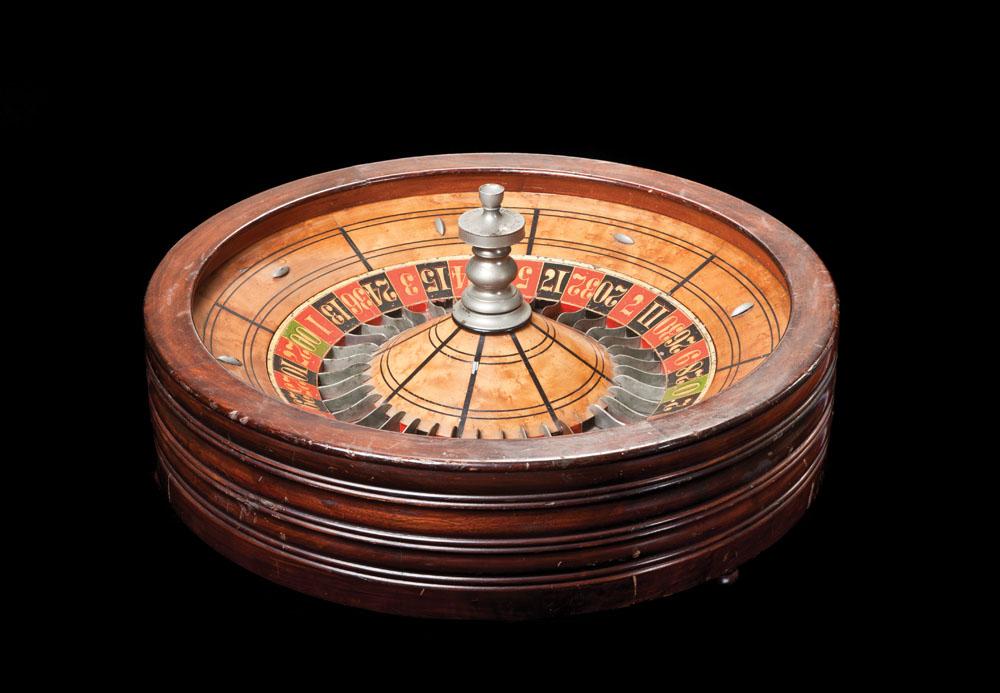 Harris & Co New York marked table top wheel, 20” dia. and 5” tall. Walnut and bird’s-eye maple with gold numbering. Missing one nickel separator.