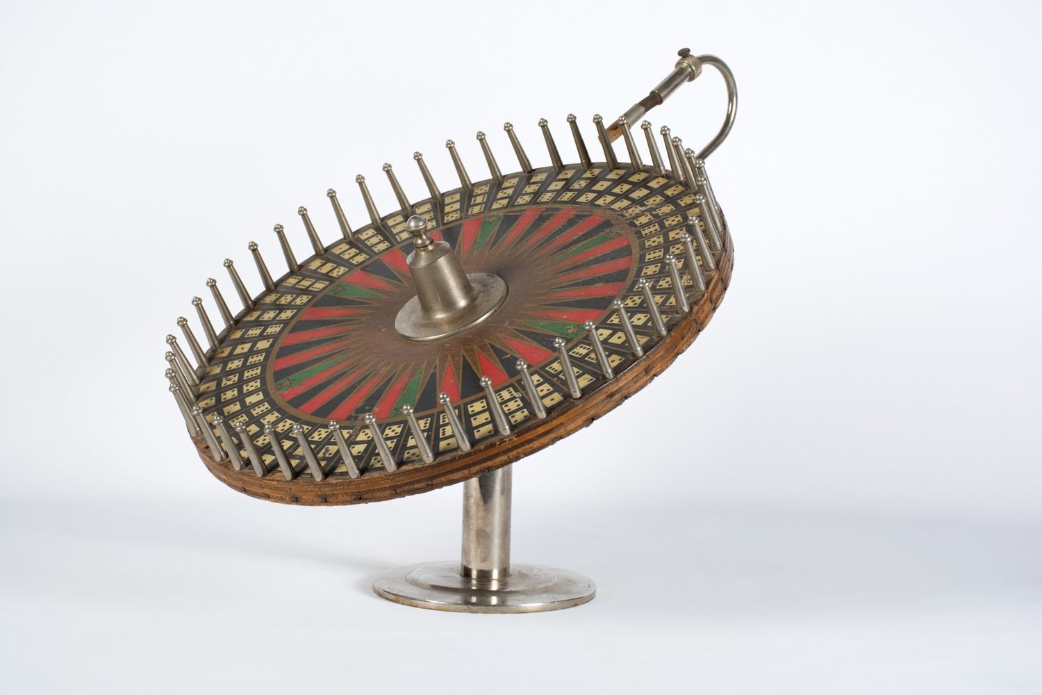 Called in the H. C. Evans catalog "Combination Chuck Luck and Red & Black Wheel" with stationary indi- cator. Nickel hardware with 15 1/2" wood wheel. 15 1/2" tall. Missing one pin, very slight paint loss.