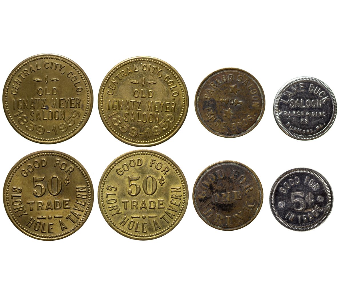 Lot of 4. 1) & 2) Old Ignatz Meyer Saloon. 1859-1959. Central City Co. GF 50c IT. Glory Hole a Tavern. Brass 32mm. 3) Lame Duck Saloon. Dunmore, PA. GF 5c IT. VF. 4) Parlor Saloon, Lynoe Bros. GF 1 Drink. 24.1mm. -60981