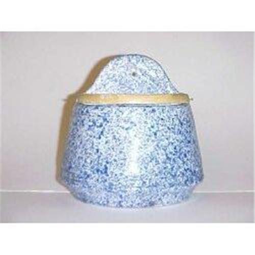 This unusual motley blue and white salt box, c. 1920s, has a wooden lid and a nail hole for hanging. The lid is held on with an original, metal pin. The box is glazed terracotta. The marking on the bottom has been purposely scrubbed out. What's left indicates Nippon-Japan.