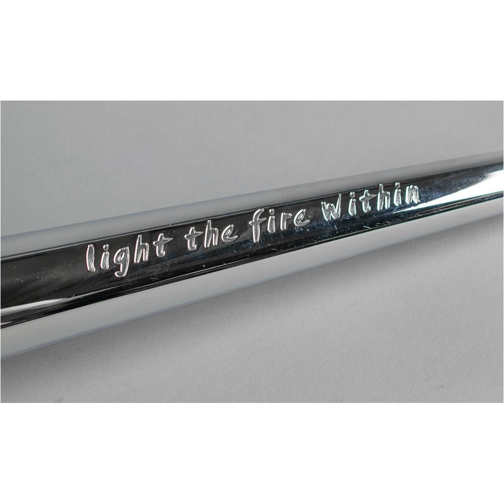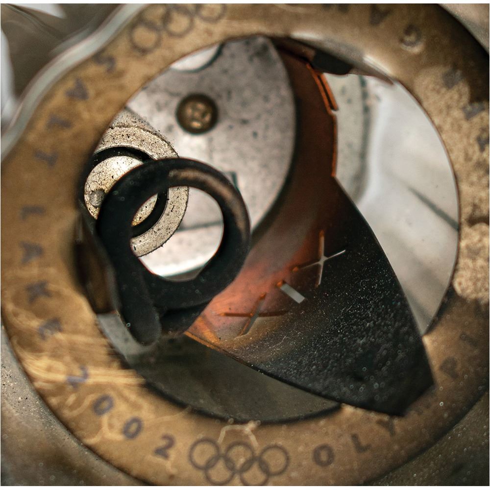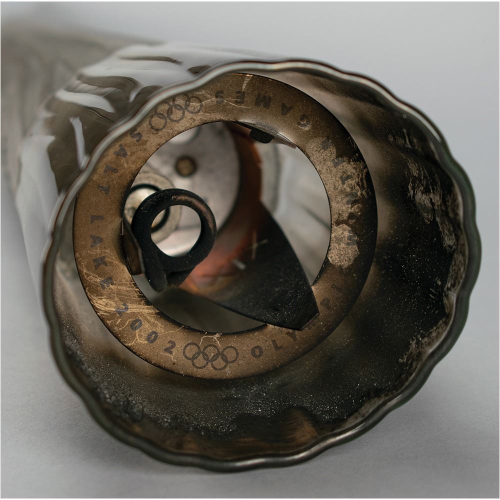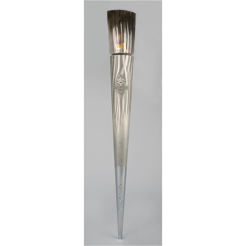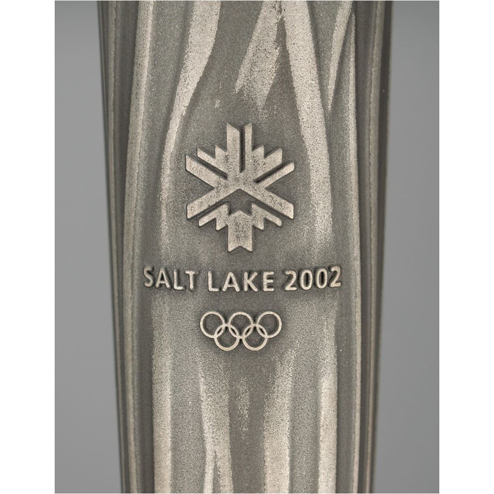 Elegant official 2002 Salt Lake City Winter Olympics torch, constructed of silvered metal, copper, and glass, measuring 32.5″ in length and 3.5″ at its widest point, designed by Axiom Design and manufactured by Coleman. The torch was modeled after an icicle and slightly curved to represent speed and fluidity, with a contrasting dull and polished finish on the handle to represent the meeting of modernity with the past. The handle, which bears an affixed "200" label, is engraved with the motto of the games, "Light the fire within," and a raised emblem of the games appears near the top. The torch bears some light scattered scuffs from use. The Olympic flame was lit in Olympia, Greece, on November 19, 2001, and began the American leg of its journey on December 4 in Atlanta. The route passed through the past host cities in the United States—Atlanta, Lake Placid, St. Louis, Los Angeles, and Squaw Valley—over a 21,725 km route.