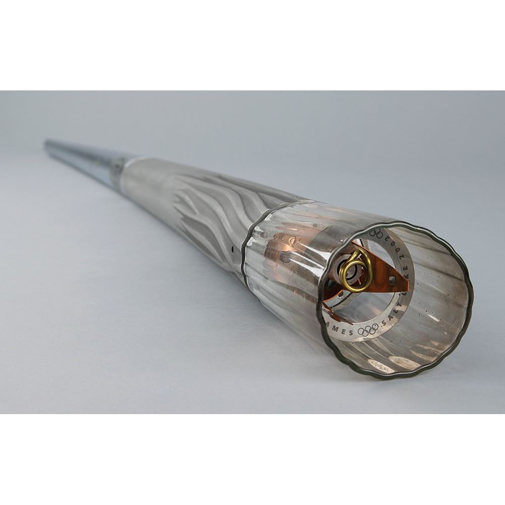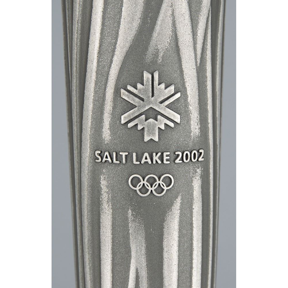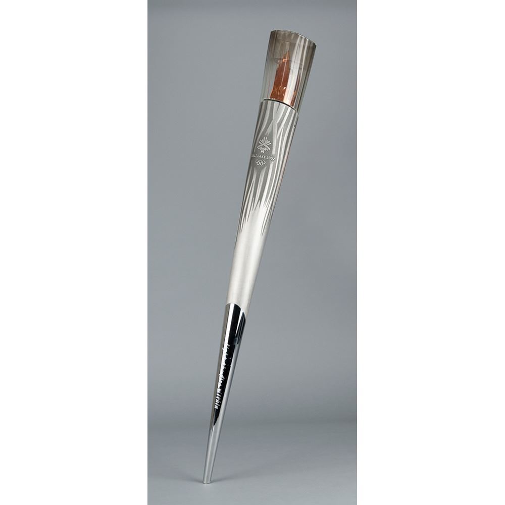 Elegant official 2002 Salt Lake City Winter Olympics torch, constructed of silvered metal, copper, and glass, measuring 32.5″ in length and 3.5″ at its widest point, designed by Axiom Design and manufactured by Coleman. The torch was modeled after an icicle and slightly curved to represent speed and fluidity, with a contrasting dull and polished finish on the handle to represent the meeting of modernity with the past. The handle, which bears an affixed "175" label, is engraved with the motto of the games, "Light the fire within," and a raised emblem of the games appears near the top. The torch bears some light scattered scuffs from use. The Olympic flame was lit in Olympia, Greece, on November 19, 2001, and began the American leg of its journey on December 4 in Atlanta. The route passed through the past host cities in the United States—Atlanta, Lake Placid, St. Louis, Los Angeles, and Squaw Valley—over a 21,725 km route.