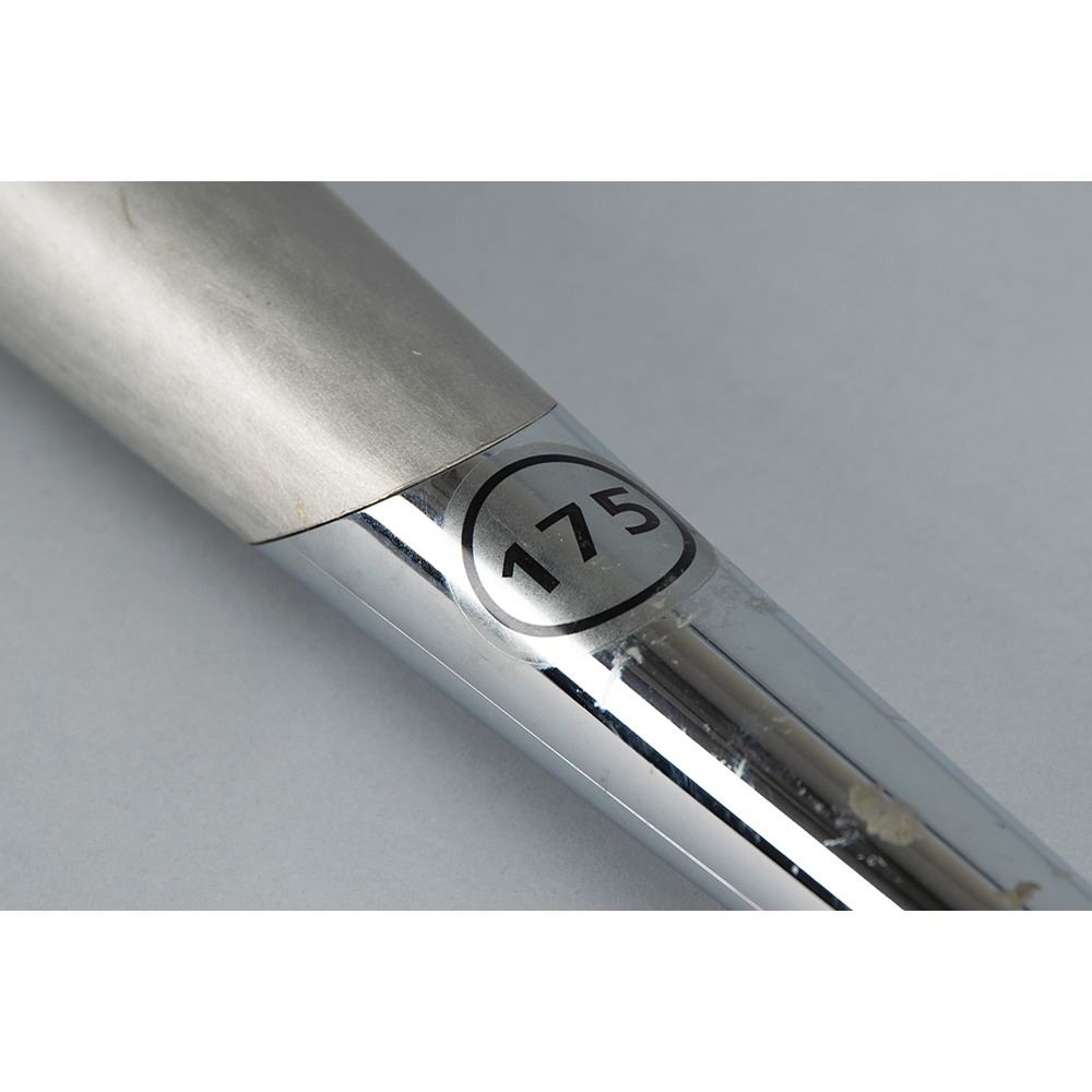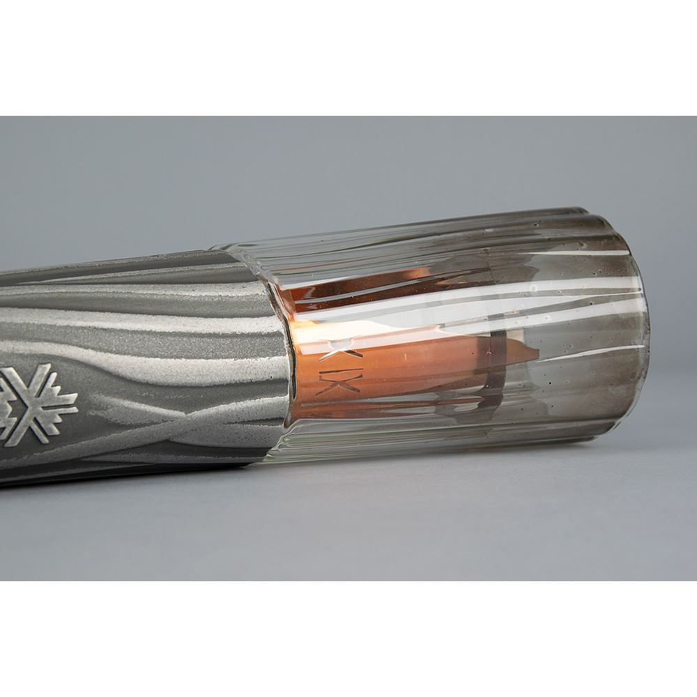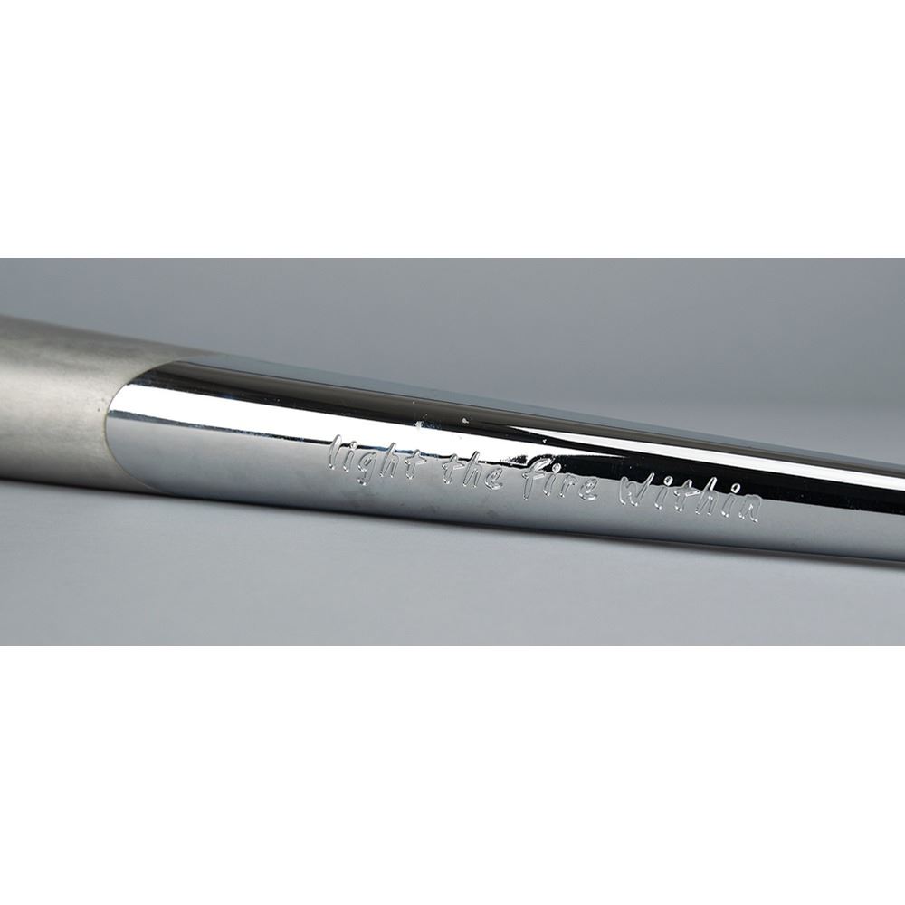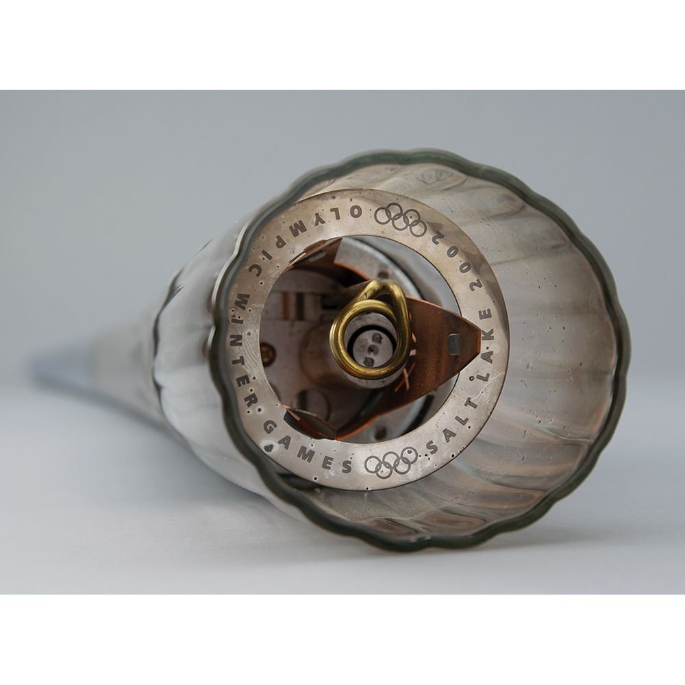 Elegant official 2002 Salt Lake City Winter Olympics torch, constructed of silvered metal, copper, and glass, measuring 32.5″ in length and 3.5″ at its widest point, designed by Axiom Design and manufactured by Coleman. The torch was modeled after an icicle and slightly curved to represent speed and fluidity, with a contrasting dull and polished finish on the handle to represent the meeting of modernity with the past. The handle, which bears an affixed "175" label, is engraved with the motto of the games, "Light the fire within," and a raised emblem of the games appears near the top. The torch bears some light scattered scuffs from use. The Olympic flame was lit in Olympia, Greece, on November 19, 2001, and began the American leg of its journey on December 4 in Atlanta. The route passed through the past host cities in the United States—Atlanta, Lake Placid, St. Louis, Los Angeles, and Squaw Valley—over a 21,725 km route.