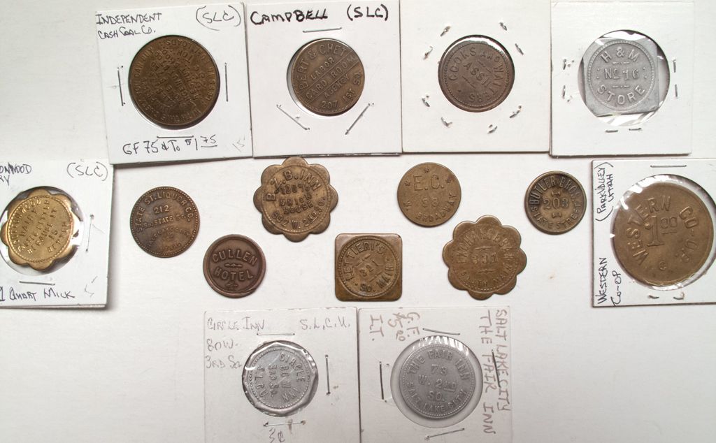 Lot of fifteen: Fair Inn, Circle Inn, Bert and Chet Card Room, H&M Store, Western Co-op, Independent Cash Coal Company, State Street Liquors, Exchange Bar, B. Z. B. Inn, Cooks and Waiters Assn., Lettieri’s, Butler Bros., Cottonwood Dairy, Cullen Hotel, etc. The last is an unlisted shape and denomination (5c) Fine to extremely fine condition.