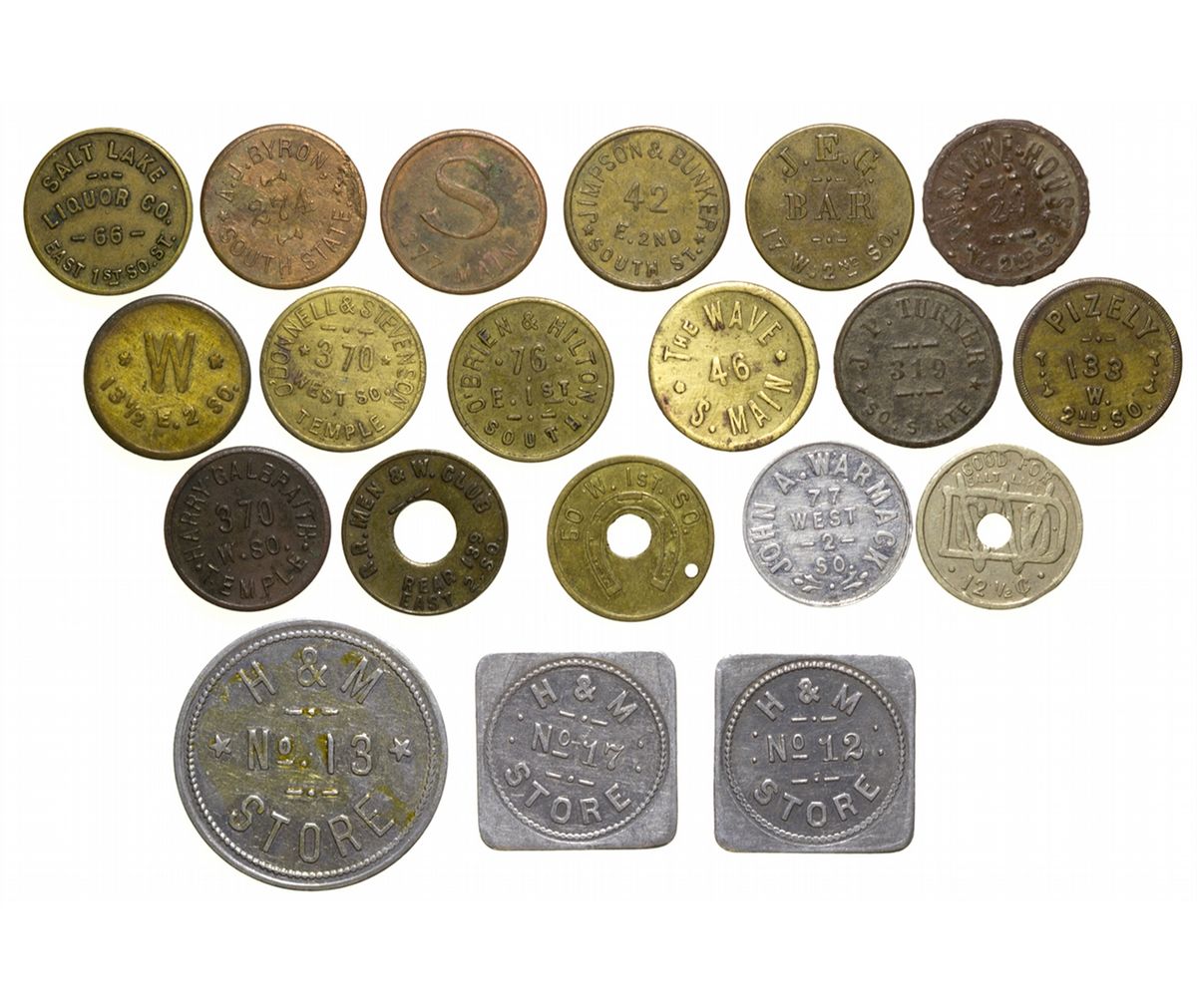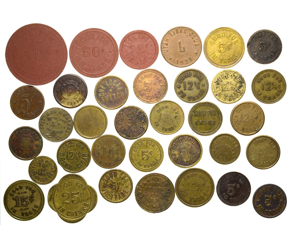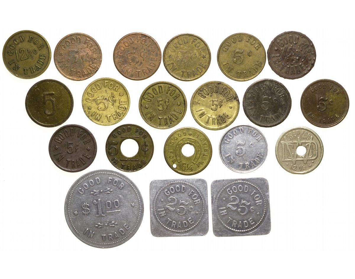 Lot of 52: incredible group of tokens from merchants such as J.H.Stevensen`s M & M, J.W Brainard`s Pastime, Judge Buffet Bldg., Golden Gate P & B (multiple), Warmack & Levan, The Wave, Show Boat, John A Wormack, The Torch, the J.E.G. Bar, and many more. All indicate good for various denominations intrade on the reverse. These range in size from 30mm to 19mm, and all sizes between. Materials range from brass, to aluminum, to copper, to plastic. None of these pieces is less than XF condition. -61458