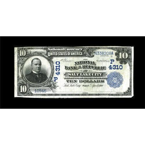 <B>Salt Lake City, UT</B></I> - $10 1902 Date Back Fr. 619 <B>The NB of the Republic</B></I> Ch. # (P)4310<BR> A <B>Fine</B></I> Date Back that remains very bright with some margin roughness. The signatures have faded and a tape repair blends in well on the back. The overall appearance is nicer than the technical grade implies. Last year at FUN this note realized over $800.<BR><BR><b>Shipping:</b> Coins & Currency (<a target="_blank" href="http://www.heritageauctions.com/common/shipping.php">view shipping information</a>)