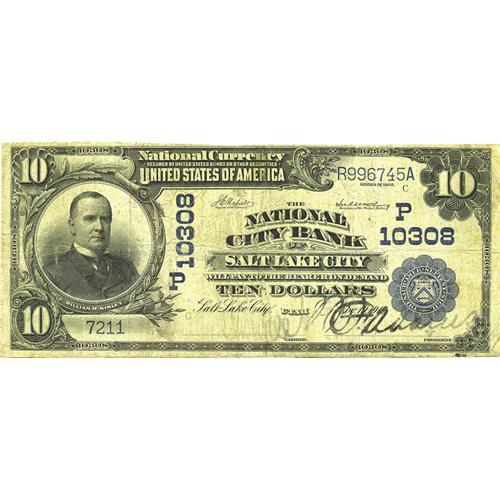 <B>Salt Lake City, UT</B></I> - $10 1902 Date Back Fr. 620 <B>The National City Bank</B></I> Ch. # (P)10308<BR>This bank did not last quite ten years before going into receivership on February 3, 1922. Kelly records only 8 large for this bank and only one of those notes is a Date Back. This newly surfaced $10 Date Back has stamped signatures of the cashier and Vice President Adams. Truly scarce and from the last note issuing bank in Salt Lake City. <B>Very Good-Fine.</B></I>