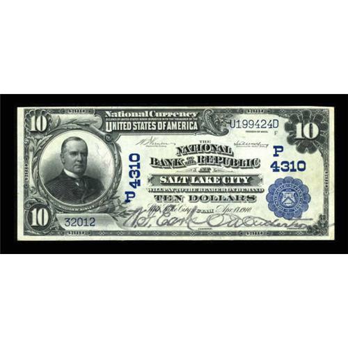 <B>Salt Lake City, UT</B></I> - $10 1902 Plain Back Fr. 627 <B>The NB of the Republic</B></I> Ch. # (P)4310<BR> A very scarce bank in high grade, with this piece one of only two in the census from this large only issuer grading higher than Very Fine. Sharp <B>Extremely Fine-About Uncirculated,</B></I> a premium example with great signatures and eye appeal. <BR><BR><b>Shipping:</b> Coins & Currency (<a target="_blank" href="http://www.heritageauctions.com/common/shipping.php">view shipping information</a>)