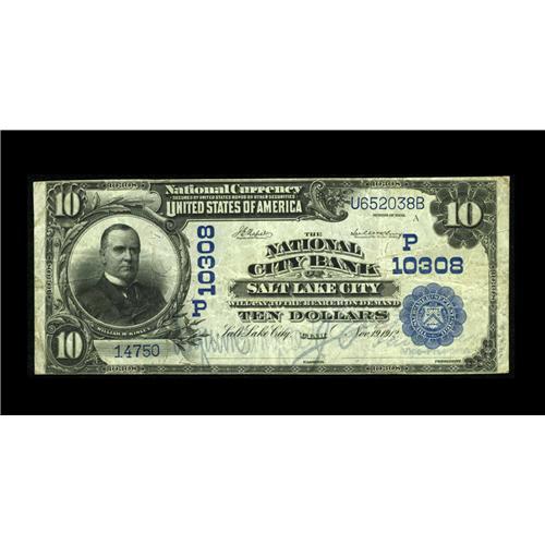 <B>Salt Lake City, UT</B></I> - $10 1902 Plain Back Fr. 628 <B>The National City Bank</B></I> Ch. # (P)10308<BR>A <B>Very Fine</B></I> note from a big city issuer with a surprisingly small population. Of a total issue approaching $1,5000,000, just $100, comprised of eight survivors, have been documented.<BR><BR><b>Shipping:</b> Coin/Currency (<a target="_blank" href="http://www.heritageauctions.com/common/shipping.php">view shipping information</a>)