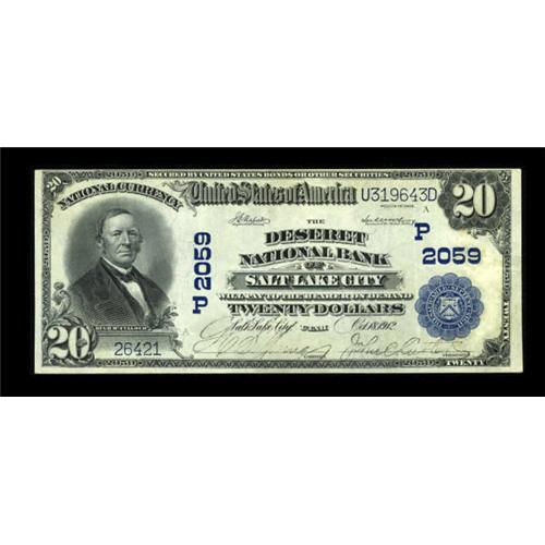 <B>Salt Lake City, UT</B></I> - $20 1902 Plain Back Fr. 654 <B>The Deseret NB</B></I> Ch. # (P)2059<BR> A high grade example which is one of the nicest Blue Seals we've ever had to offer from this historic institution. <B>Extremely Fine.</B></I><BR><BR><b>Shipping:</b> Coins & Currency (<a target="_blank" href="http://www.heritageauctions.com/common/shipping.php">view shipping information</a>)
