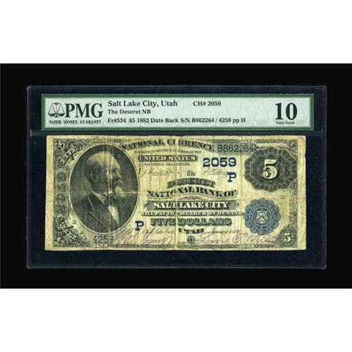 <B>Salt Lake City, UT</B></I> - $5 1882 Date Back Fr. 534 <B>The Deseret NB</B></I> Ch. # (P)2059<BR> A second example which is more than acceptable, although not nearly as high grade as the note above, <B>PMG Very Good 10</B></I>. It is still scarce enough to see bidding reach or exceed...<BR><BR><b>Shipping:</b> Coins & Currency (<a target="_blank" href="http://www.heritageauctions.com/common/shipping.php">view shipping information</a>)