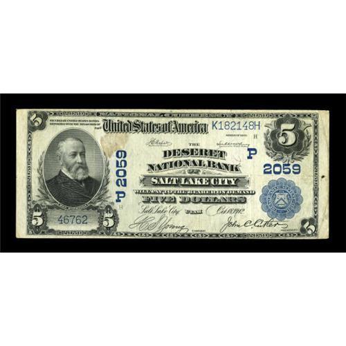 <B>Salt Lake City, UT</B></I> - $5 1902 Plain Back Fr. 602 <B>The Deseret NB</B></I> Ch. # (P)2059<BR> Plate engraved signatures of Young and Cutler are noted at bottom. Original paper and solid margins make up for the couple of stains that are present but hardly distracting. <B>Very Fine.</B></I><BR><BR><b>Shipping:</b> Coins & Currency (<a target="_blank" href="http://www.heritageauctions.com/common/shipping.php">view shipping information</a>)