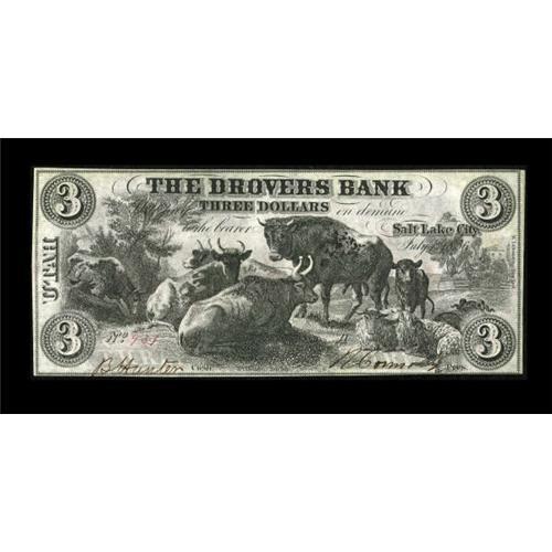 <B>Salt Lake City, UT- The Drovers Bank</B></I> $3 July 1, 1856 G6a Rust 85<BR> This is the first $3 that we have been able to offer on this bank. It is beautiful, with original paper surfaces and the penned signatures of B. Hunter and R. CermaIly. This note was printed by famed engraver W.L. Ormsby. <B>Choice Crisp Uncirculated</B></I>.<BR><BR><b>Shipping:</b> Coins & Currency (<a target="_blank" href="http://www.heritageauctions.com/common/shipping.php">view shipping information</a>)