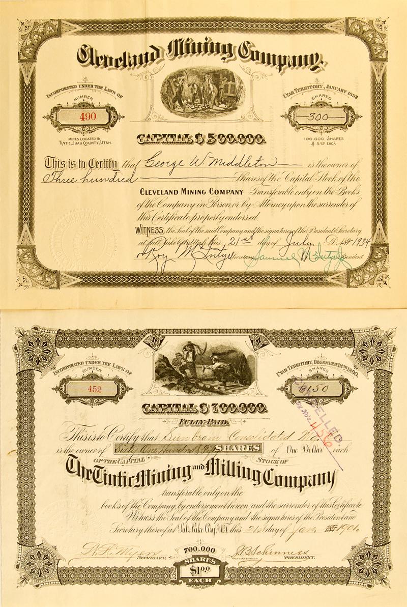 Lot of two. 1) Tintic Mining and Milling Co. Incorporated in Dec. 18, 1890 in Utah. No. 452 issued Jan. 21, 1901 for 6150 shares. Signed by J.B. Schinness, Pres. Vignette of miners with pick and ore cart. Blk on crème. 2) Cleveland Mining Co. Incorporated Jan. 1892 in Utah. No. 490 issued July 21, 1934 for 300 shares. Signed Samuel McIntyre, Jr., Pres., Roy McIntyre, Secr. Vignette of miners with headlamps. Blk on crème.