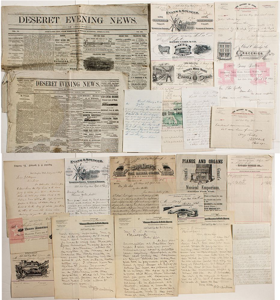 1870 This is a lot 25 assorted pieces of ephemera from the Salt Lake City region, circa 1880’s. Included in the lot are receipts from Salt Lake Lithography & Publishing, Browning Bros. Firearms & Ammunition, Evans & Spencer Sporting Goods, Calder’s Music Palace, Young Bros., Sam Levy Fine Havana Cigars and a grocery bill from Clark Eldredge. There are also two editions of the Deseret Evening News , one dated March 8, 1870, the other, April 3, 1873. This is a fun lot and should draw a lot of attention. Lynn Langdon Collection - HKA#65620