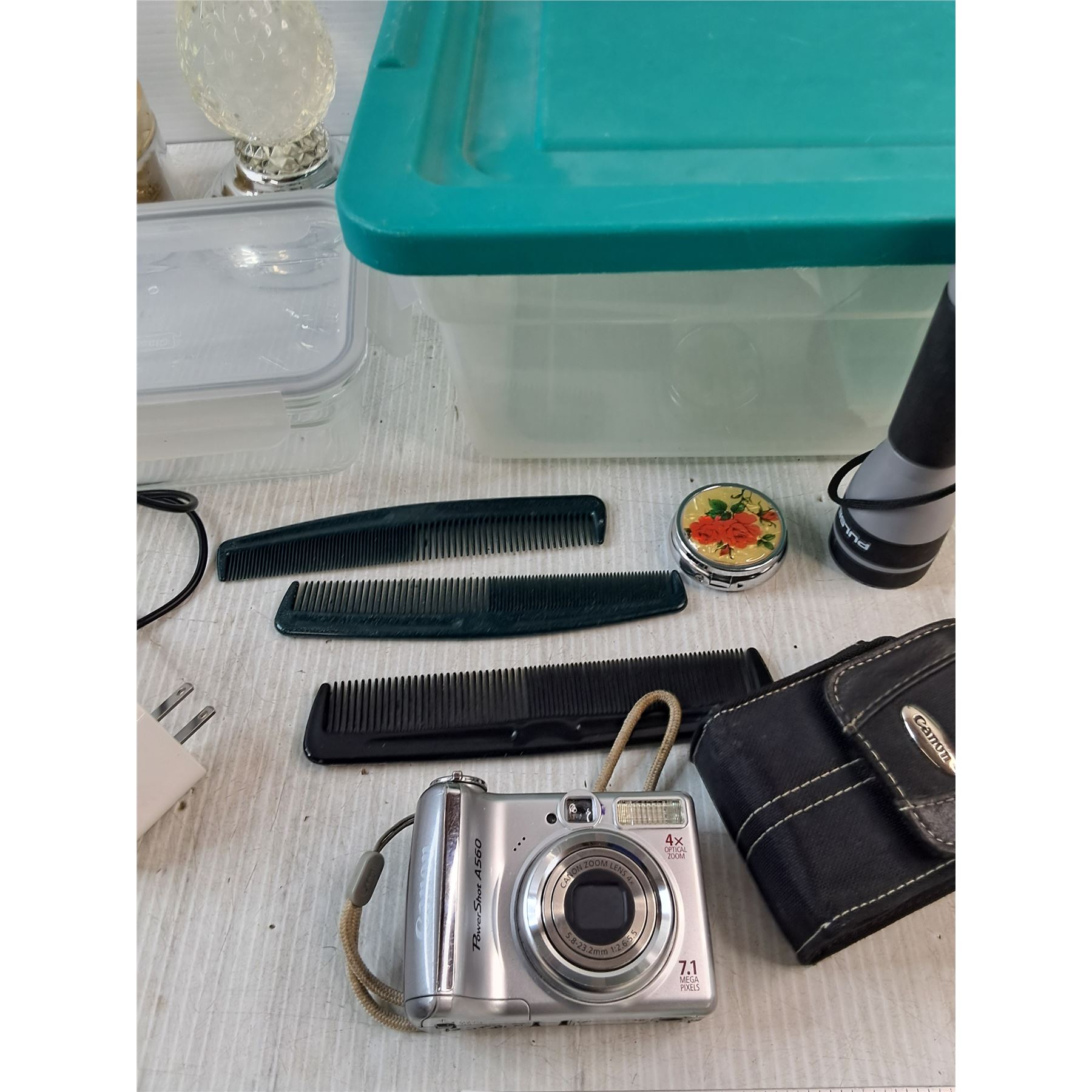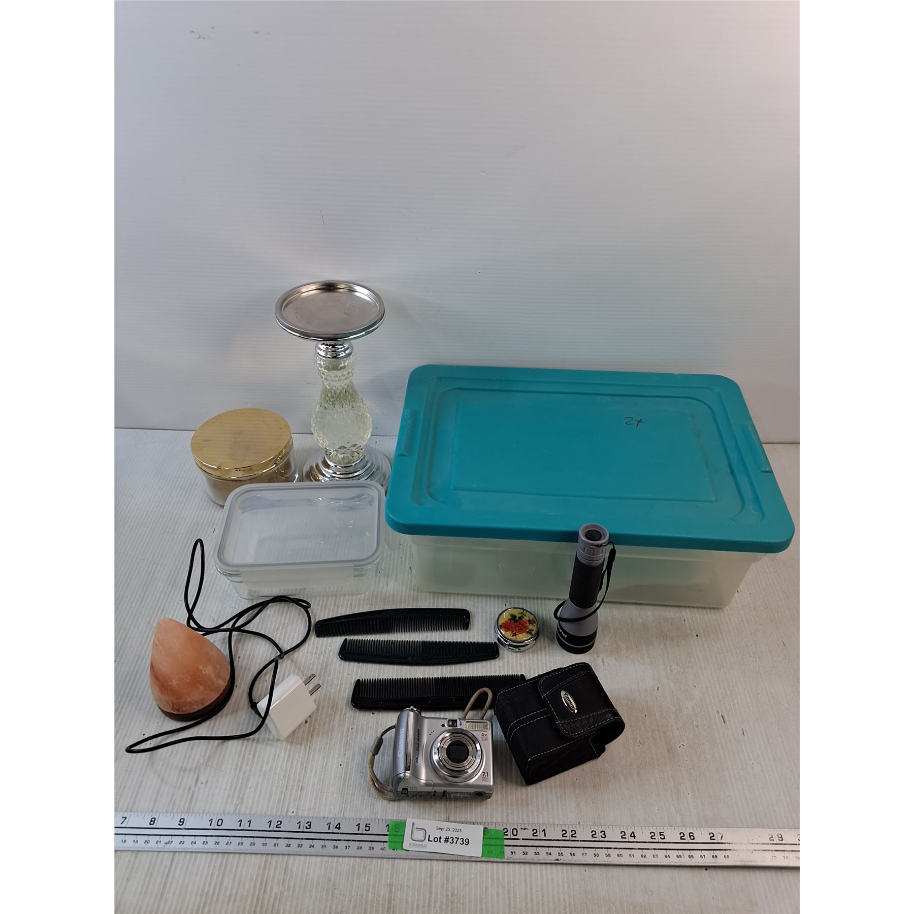 Salt Lamp, Flashlight, Canon PowerShot A560 Camera - As Is, Hair Brushes, Plastic Container Misc