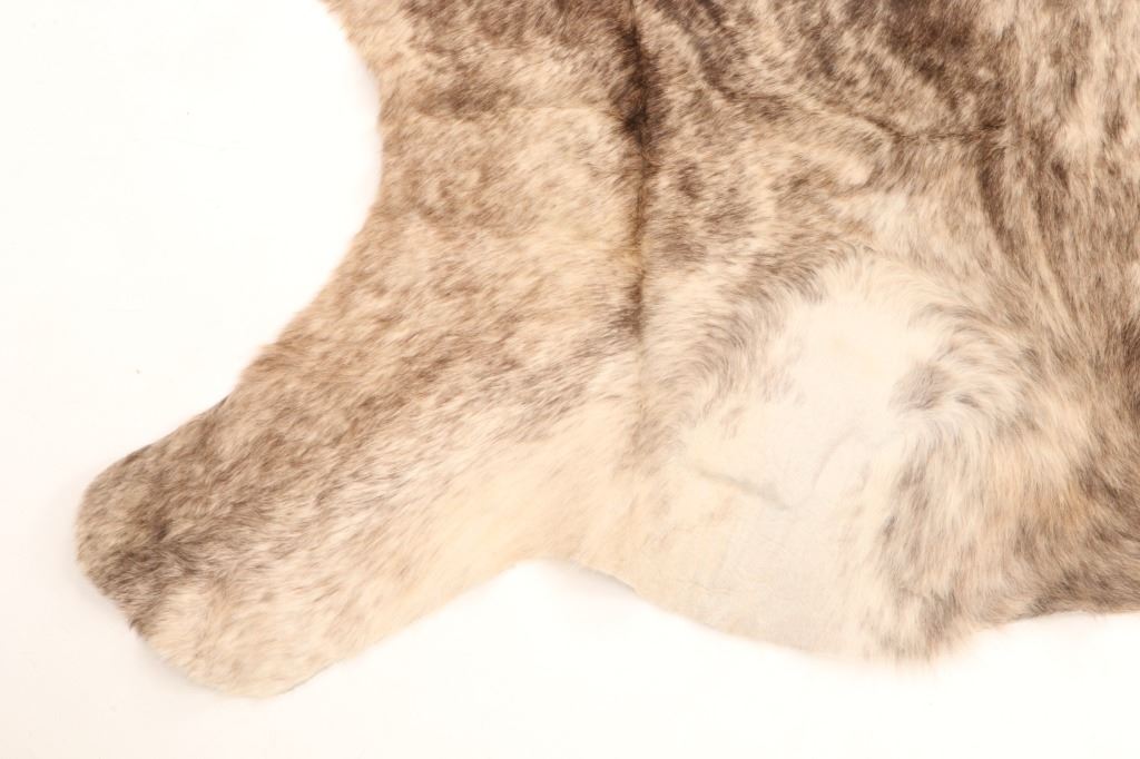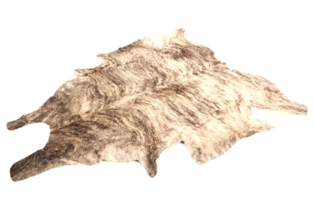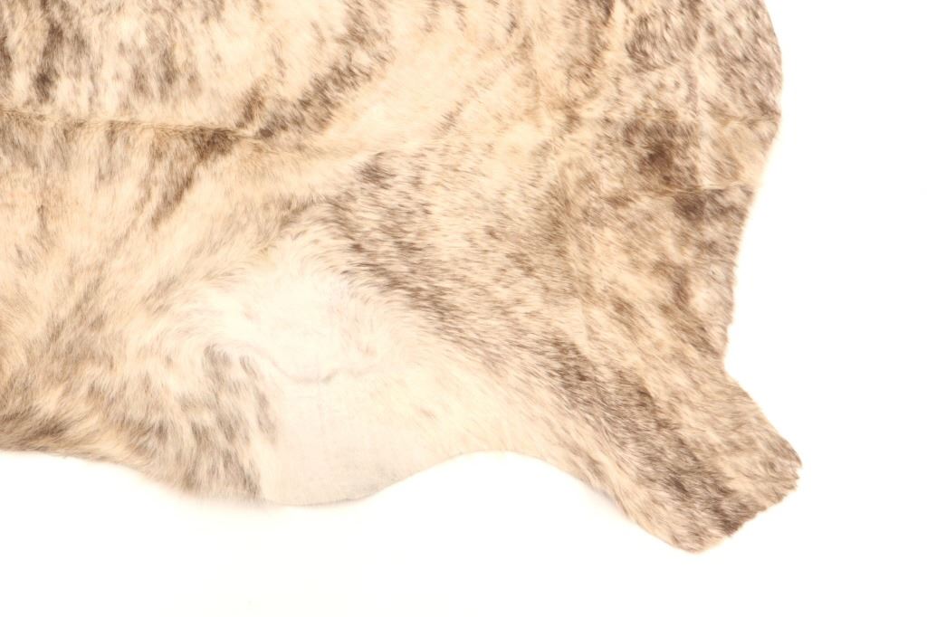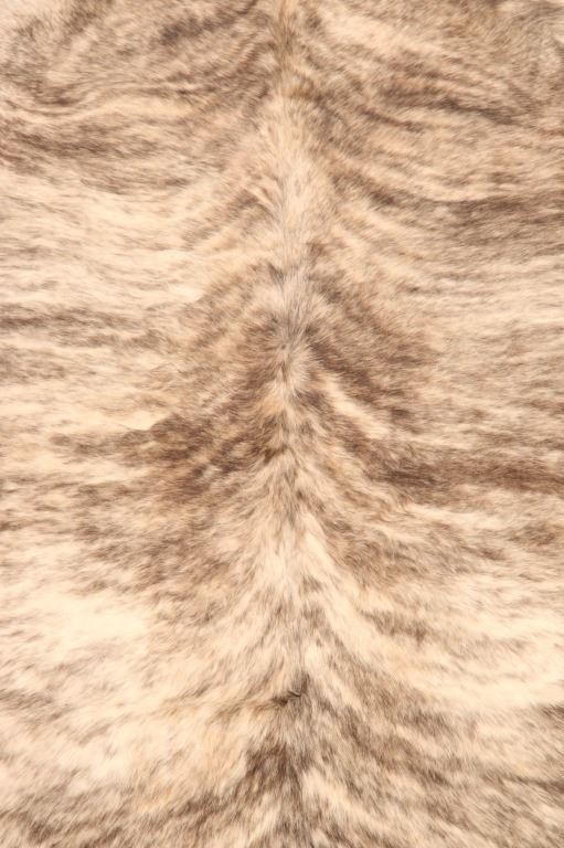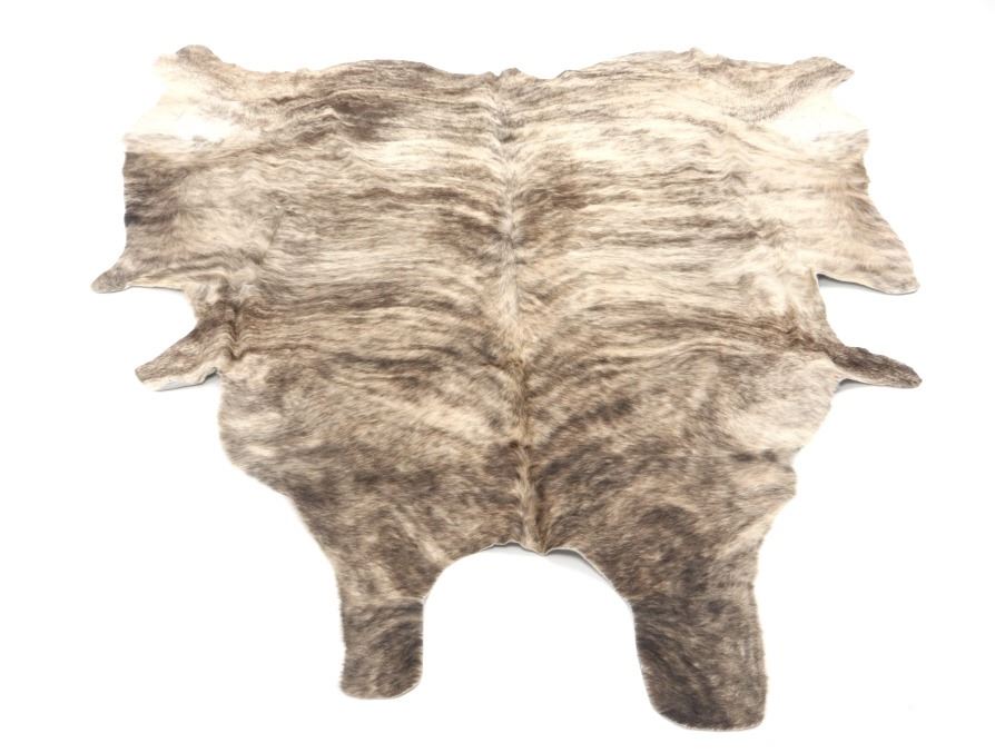 This is an excellent and unique, premium cowhide rug with beautiful salt and pepper brindle, light grey to grey coloring that fades to darker stripes and speckled patterns, giving it a bi-coloration; it is sometimes described as "tiger-striped”, although the brindle pattern is more subtle than that of a tiger's coat. In brindle coloration, the streaks of color are irregular and darker than the base color of the coat, although very dark markings can be seen on a coat that is only slightly lighter. The cowhide (also referred to as cow hide, steer hide, steer hide) is a brand-new example that has been professionally tanned and is in pristine condition. The rug is also considered an Extra-Large (XL) to Extra-Extra-Large (XXL) size, being 8 feet 4 inches long by 7 feet 1 inches. 8'4" x 7'1"