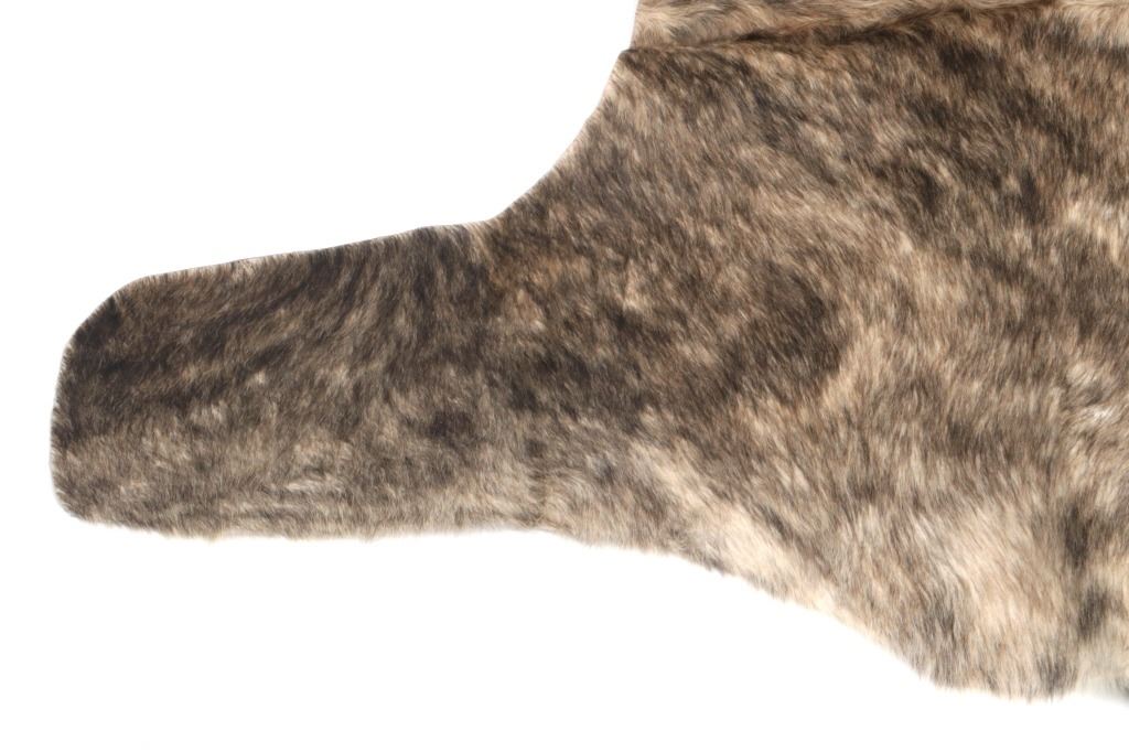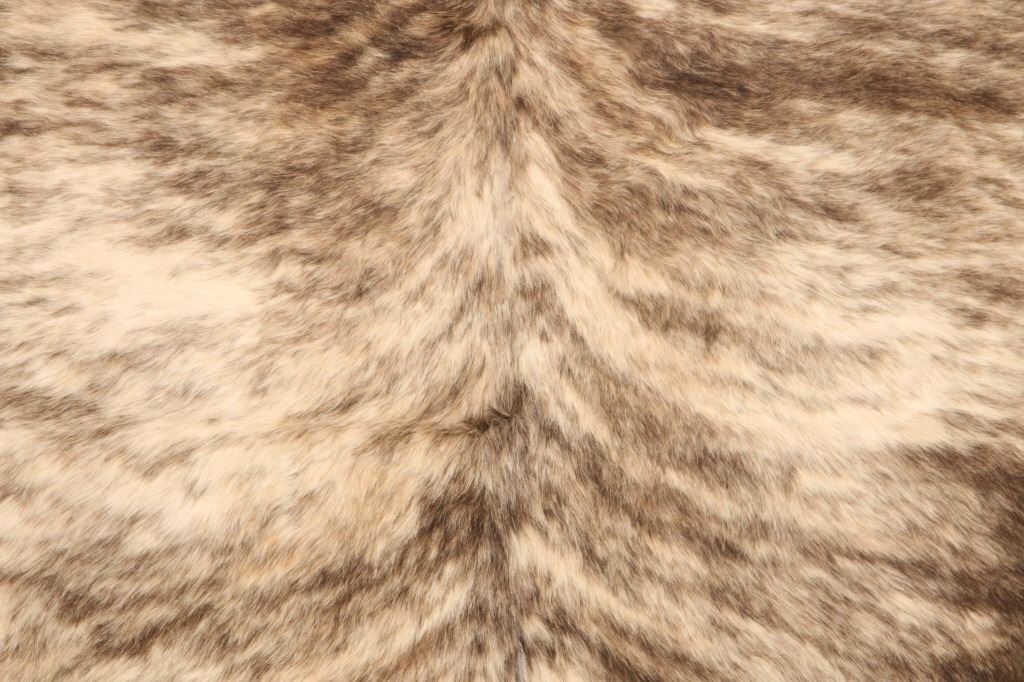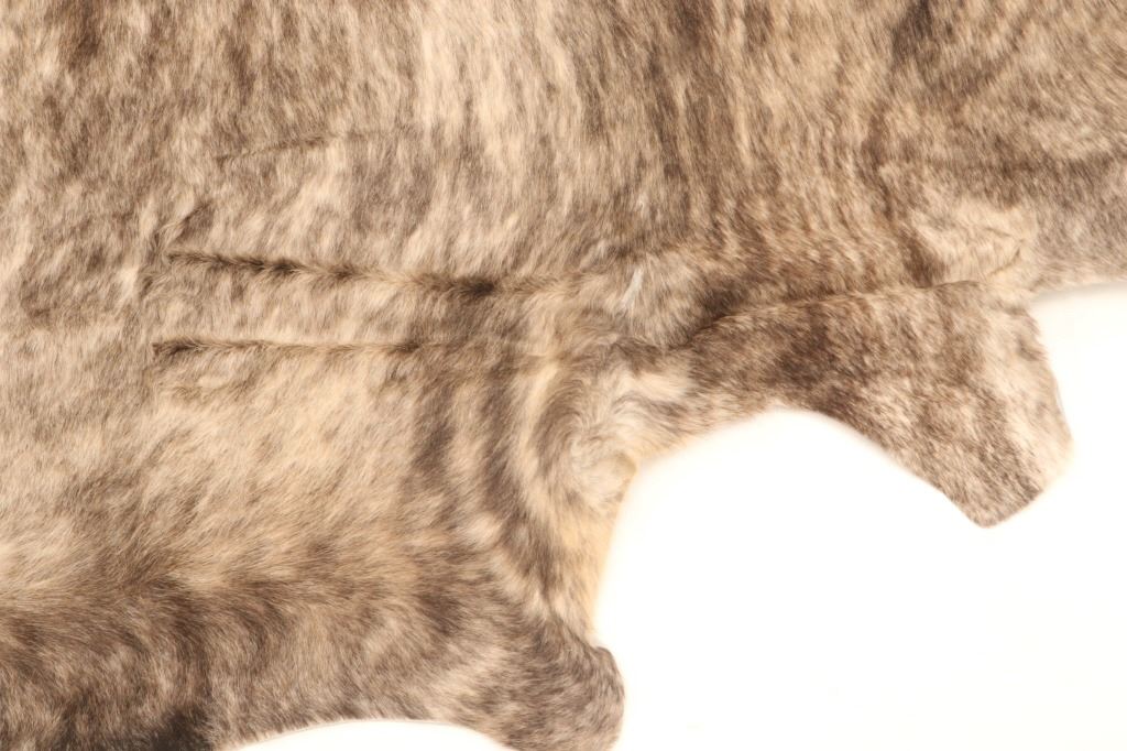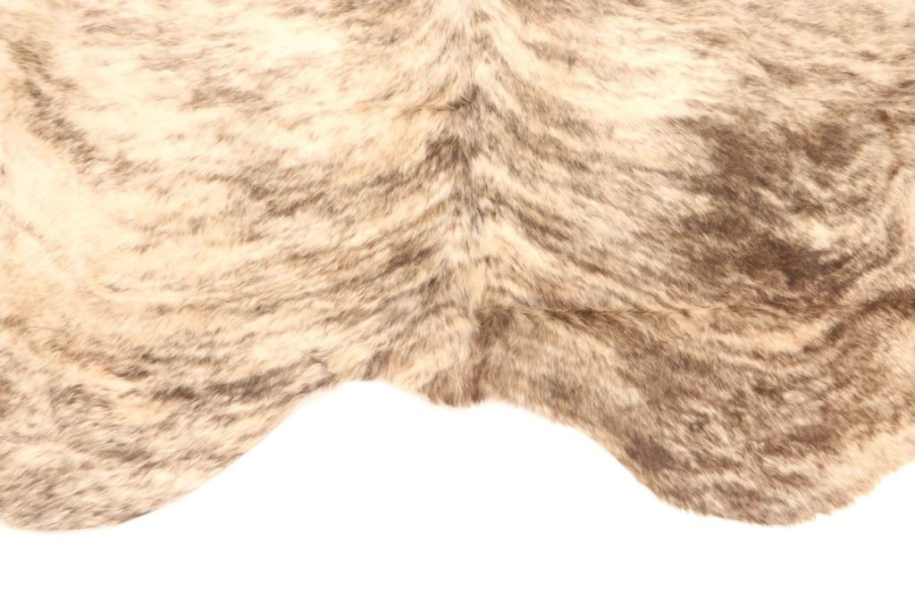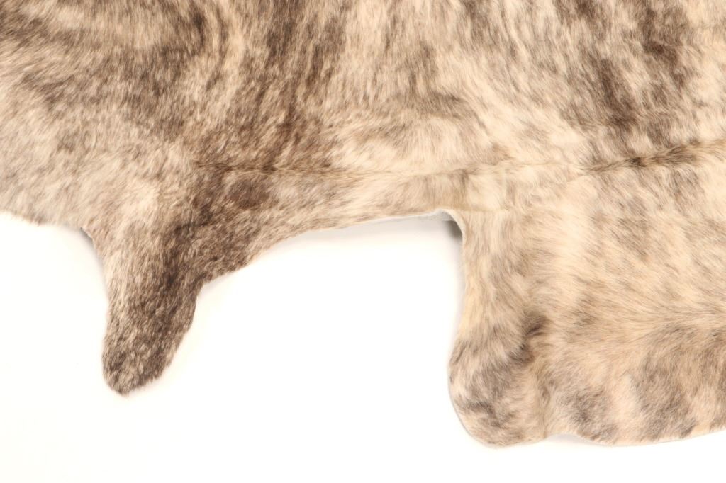 This is an excellent and unique, premium cowhide rug with beautiful salt and pepper brindle, light grey to grey coloring that fades to darker stripes and speckled patterns, giving it a bi-coloration; it is sometimes described as "tiger-striped”, although the brindle pattern is more subtle than that of a tiger's coat. In brindle coloration, the streaks of color are irregular and darker than the base color of the coat, although very dark markings can be seen on a coat that is only slightly lighter. The cowhide (also referred to as cow hide, steer hide, steer hide) is a brand-new example that has been professionally tanned and is in pristine condition. The rug is also considered an Extra-Large (XL) to Extra-Extra-Large (XXL) size, being 8 feet 4 inches long by 7 feet 1 inches. 8'4" x 7'1"