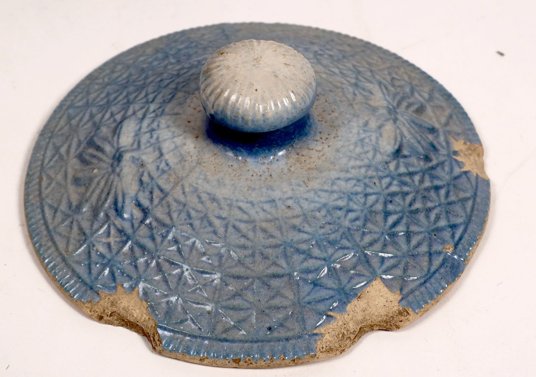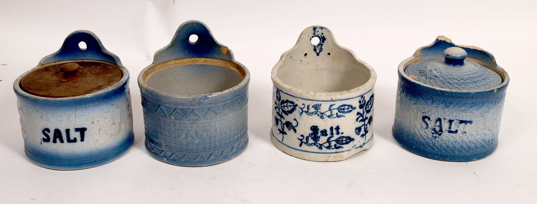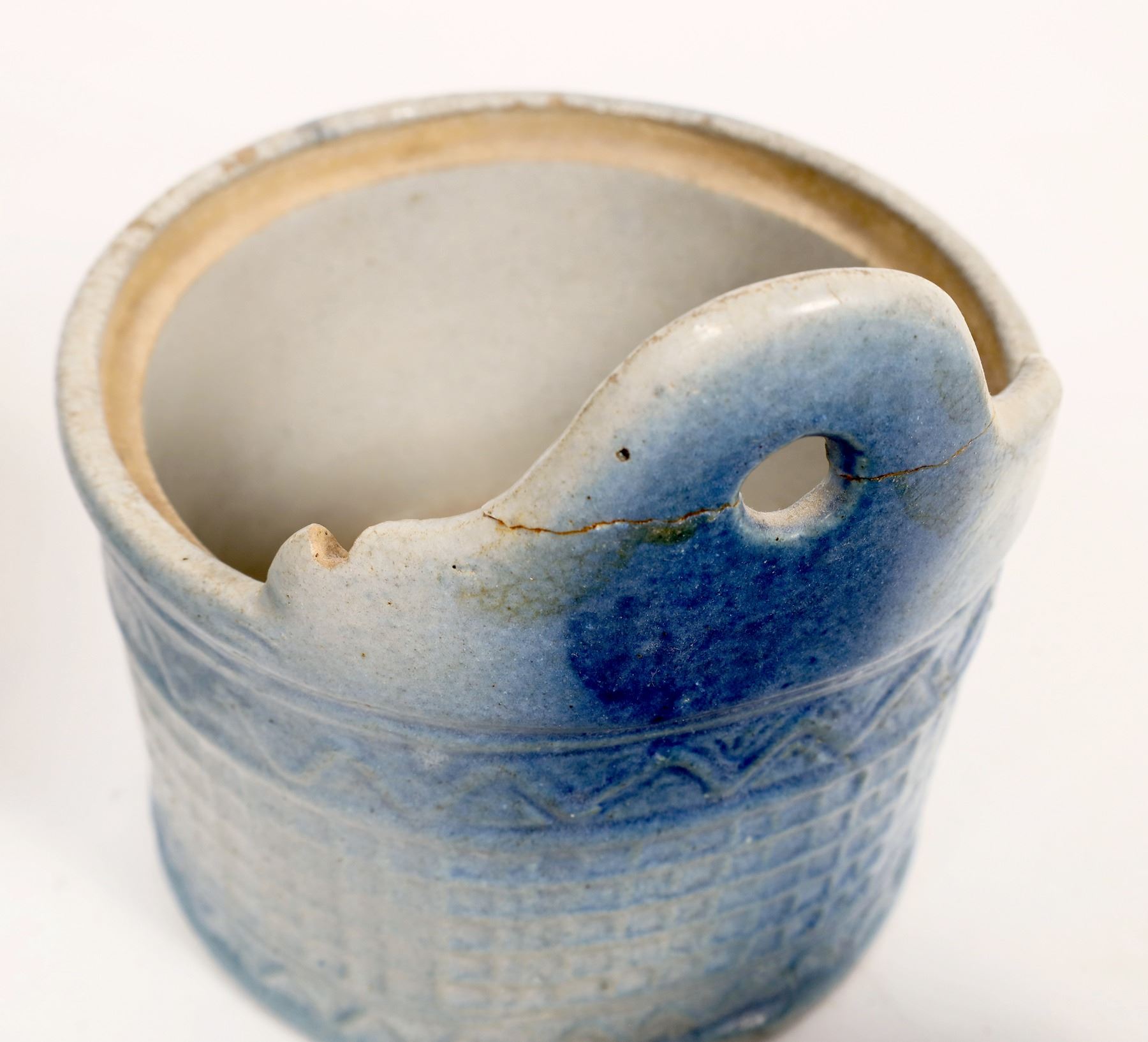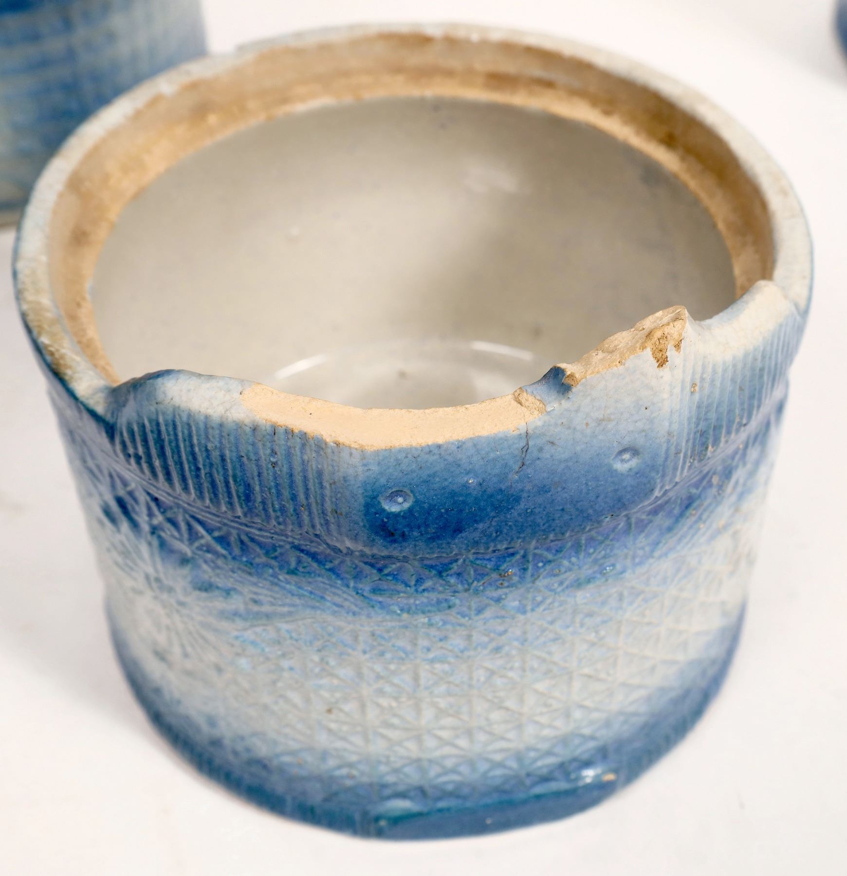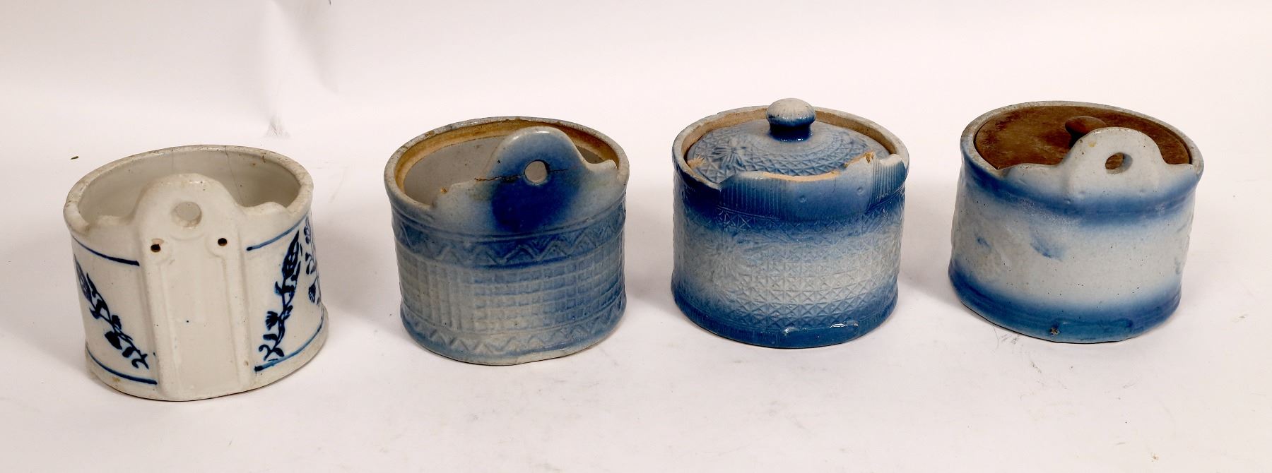 4 different pieces of salt stoneware. Blue with ridge pattern. 6x5.75", repaired top and .5" chip. X pattern with lid,5x5.75", missing back and multiple chips. White/blue, 5.75x6", 2 large cracks and bottom chip. Blue with embossed grapes and original wood lid. 5.75x5.75". 3.5" side crack and ding.