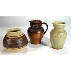 Salt glazed stoneware jug, a Bullers studio pottery vase with a band of incised decoration and a studio pottery vase with a band of stylised decoration, largest 23cm high