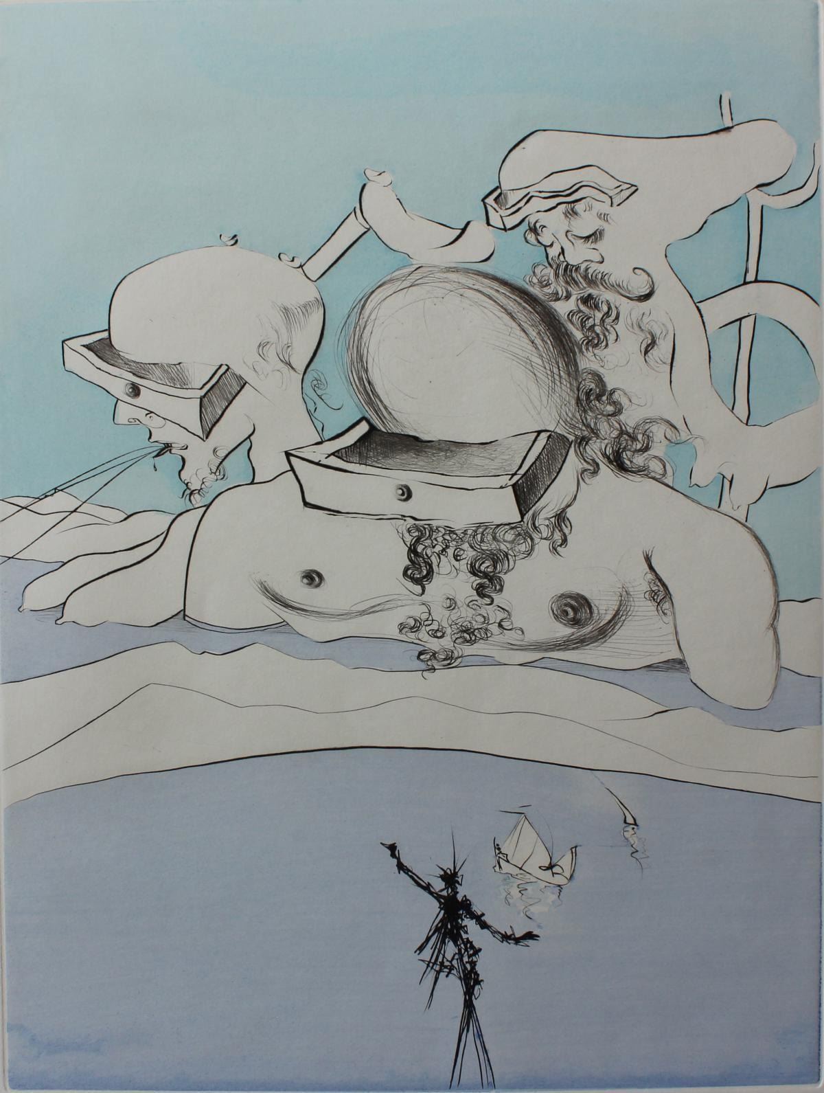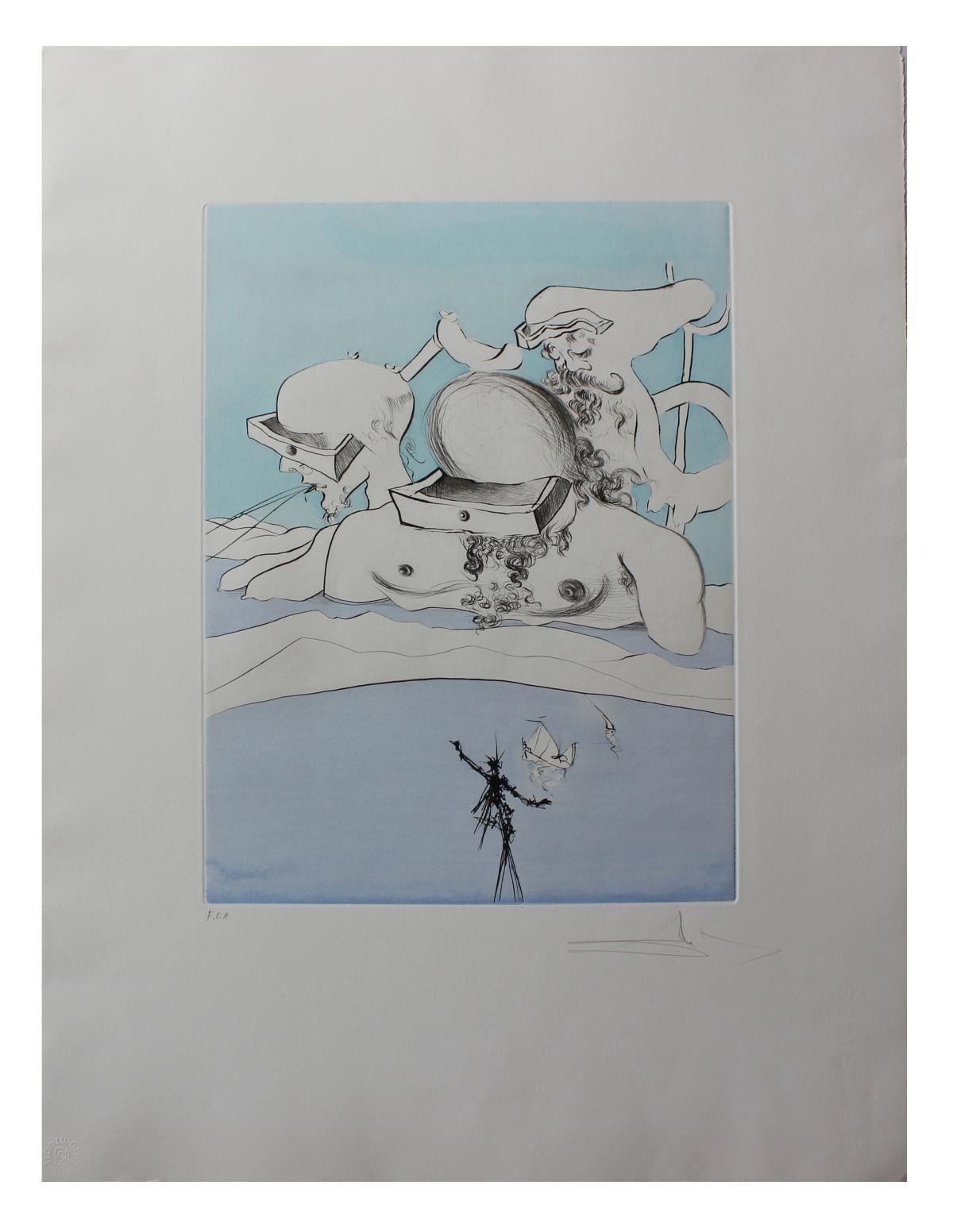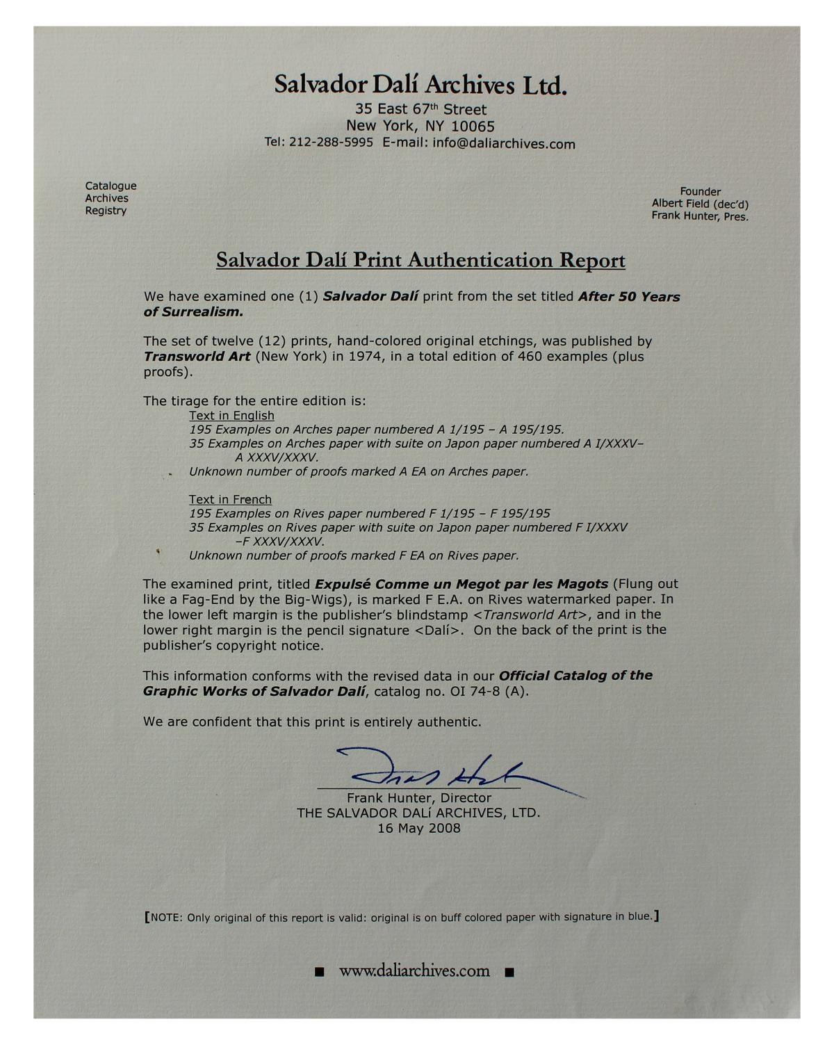 Artist: Salvador Dali. Medium: Hand Colored Original Etching. Title: Flung Out Like a Fag-End by the Big-Wigs. Size (Unframed): 25.5" x 19.5". Certificate of Authenticity: From Frank Hunter. Reference# 10440.