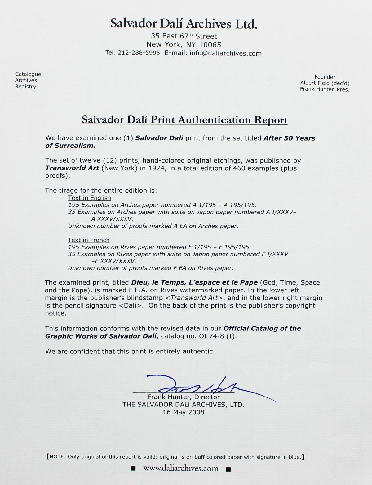Artist: Salvador Dali. Medium: Hand Colored Original Etching. Title: God, Time, Space and the Pope. Size (Unframed): 26" x 20". Certificate of Authenticity: From Frank Hunter. Reference# 13685.