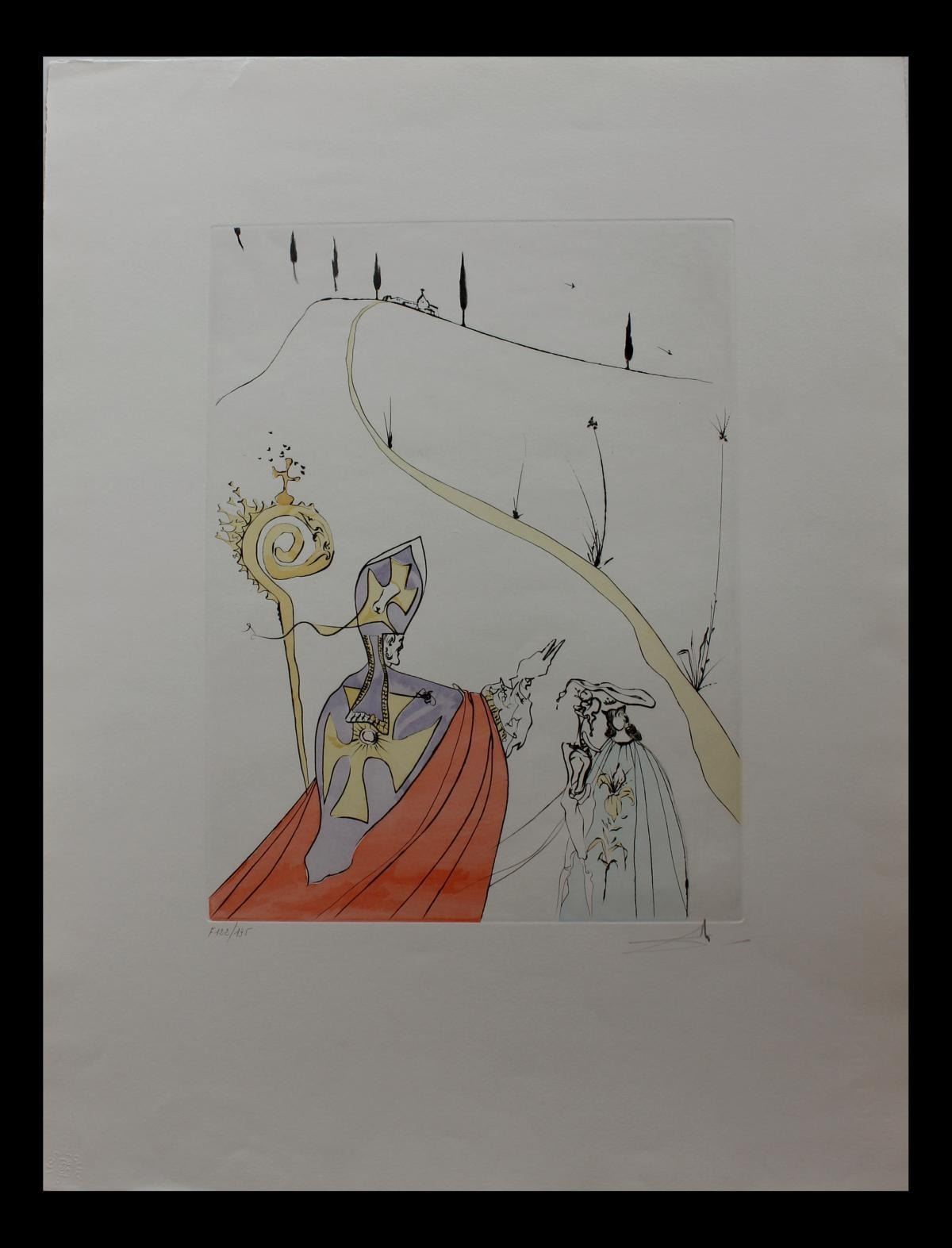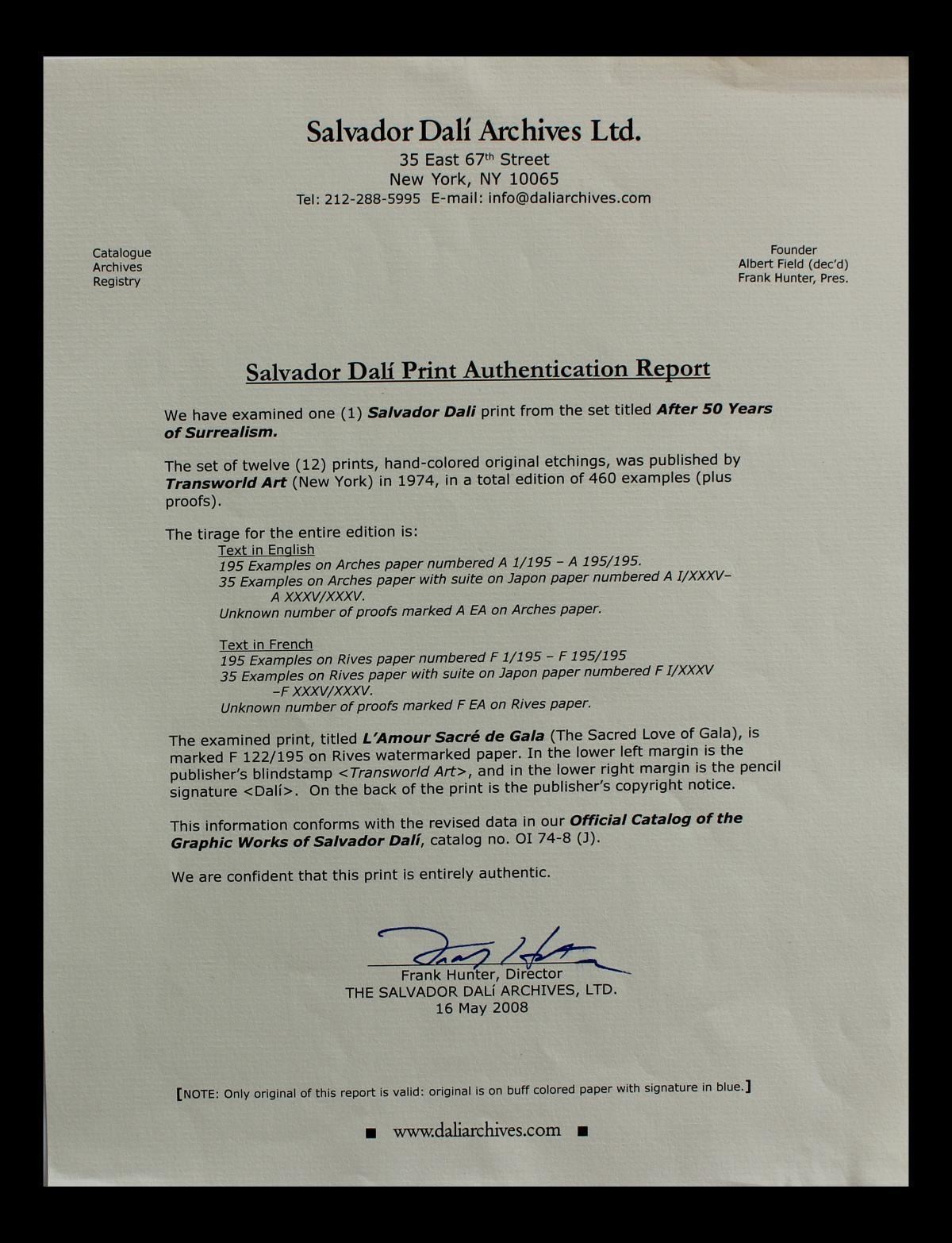 Artist: Salvador Dali. Medium: Hand Colored Original Etching. Title: The Sacred Love of Gala. Size (Unframed): 25.5" x 19.5". Certificate of Authenticity: From Frank Hunter. Reference# 10460.