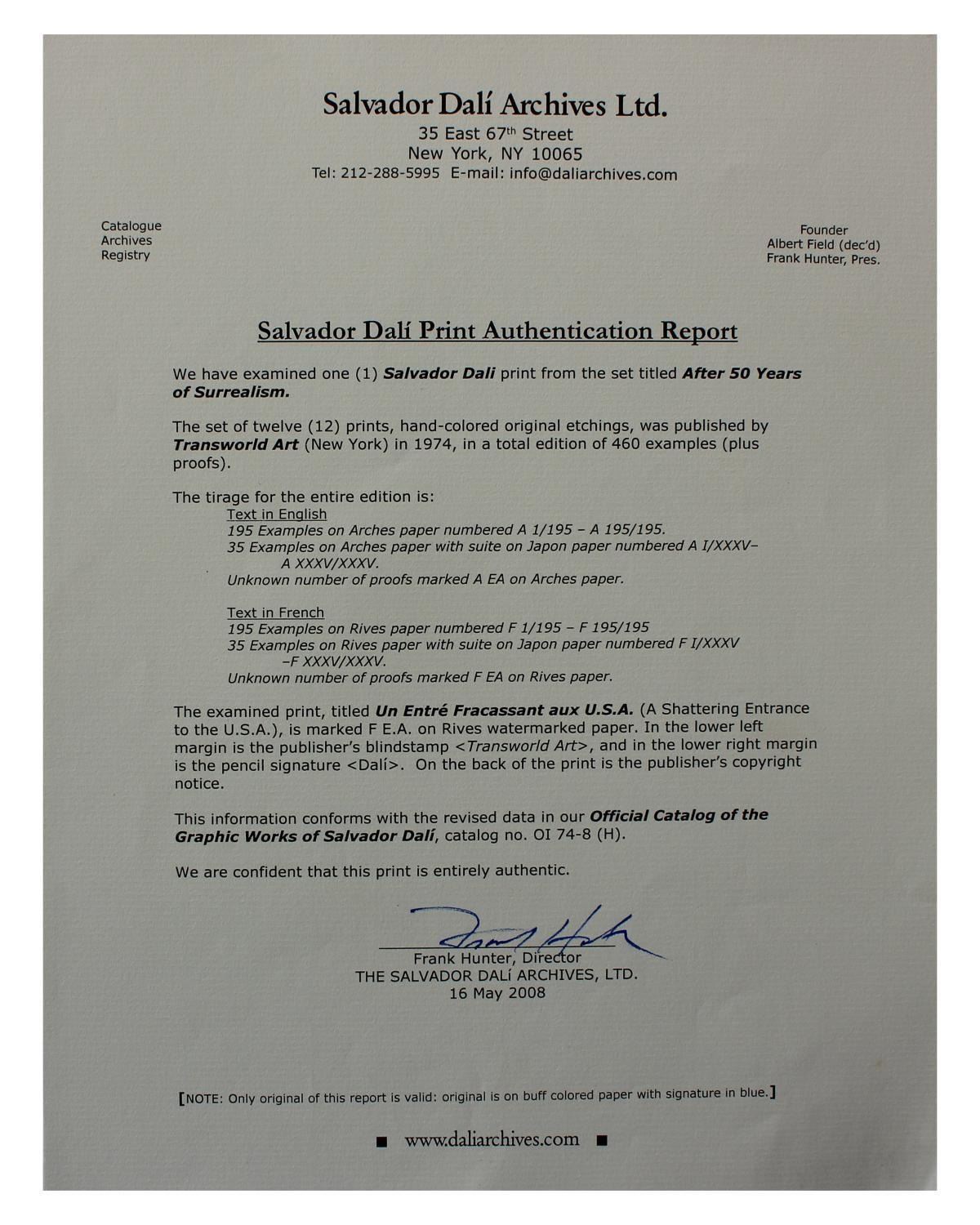 Artist: Salvador Dali. Medium: Hand Colored Original Etching. Title: Un Entre Fracassant aux U.S.A. Size (Unframed): 25.5" x 19.5". Certificate of Authenticity: From Frank Hunter. Reference# 10444.