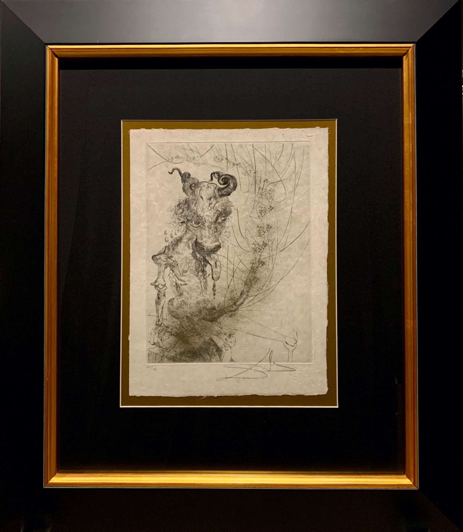 Salvador Dali (1904-1989) Original hand signed, also stamp signed, hand colored, numbered etching on Japanese Paper. Titled "Téte de Veau" from the "Faust" series. Very rare, edition of 64 out of 145, sheet 15 x 11 in, framed 30 x 26 inches. Reference: Field 69-1 G, also Bruce Hochman's price guide, 2011 value $12,000.