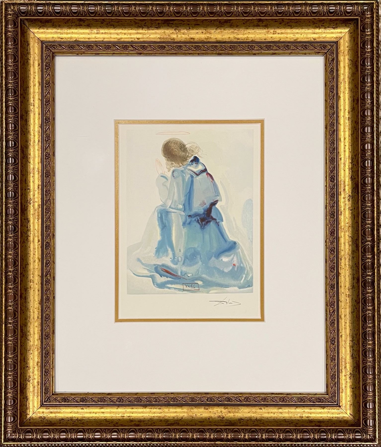 Salvador Dali (1904-1989) Original color woodblock, hand signed by Dali in pencil, 1964. From the suite The Divine Comedy, Cantique: Le Paradise. Editions Les Heures Claires, Paris. Authenticated and countersigned by the publisher artistic director Jean Estrade on verso. New frame, guaranteed authentic, COA provided. Sheet 12 15/16 x 10 1/4 in, framed 26 x 22 inches.