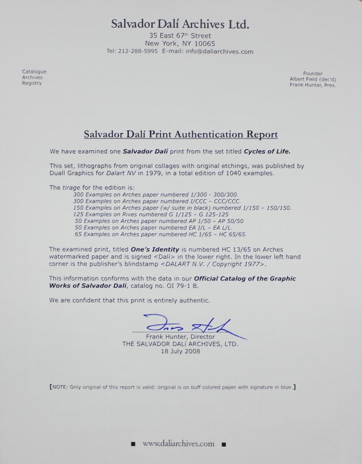 Artist: Salvador Dali. Medium: Lithograph with original collages with original etchings. Title: One's Identity. Size (Unframed): 14.5" x 22". Certificate of Authenticity: From Frank Hunter. Reference# 15952.