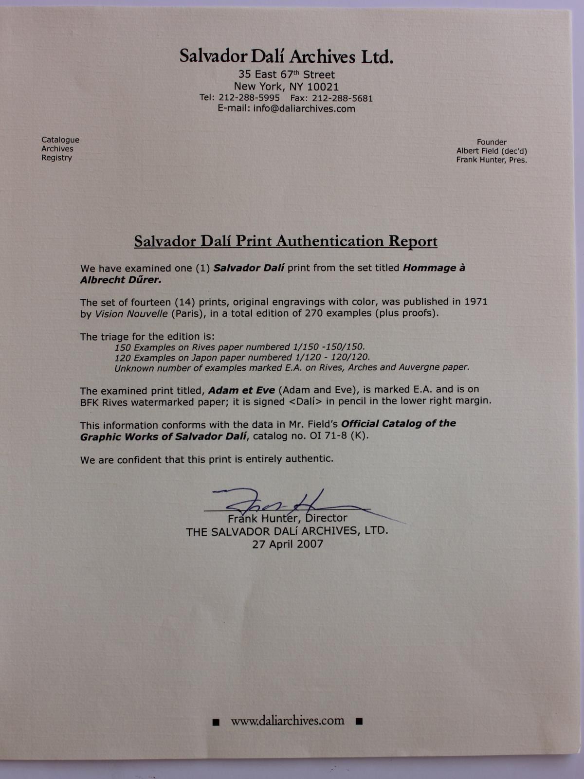 Artist: Salvador Dali. Medium: Original Engravings with Color. Title: Adam and Eve. Size (Unframed): 30" x 22". Certificate of Authenticity: From Frank Hunter. Reference# 10409.