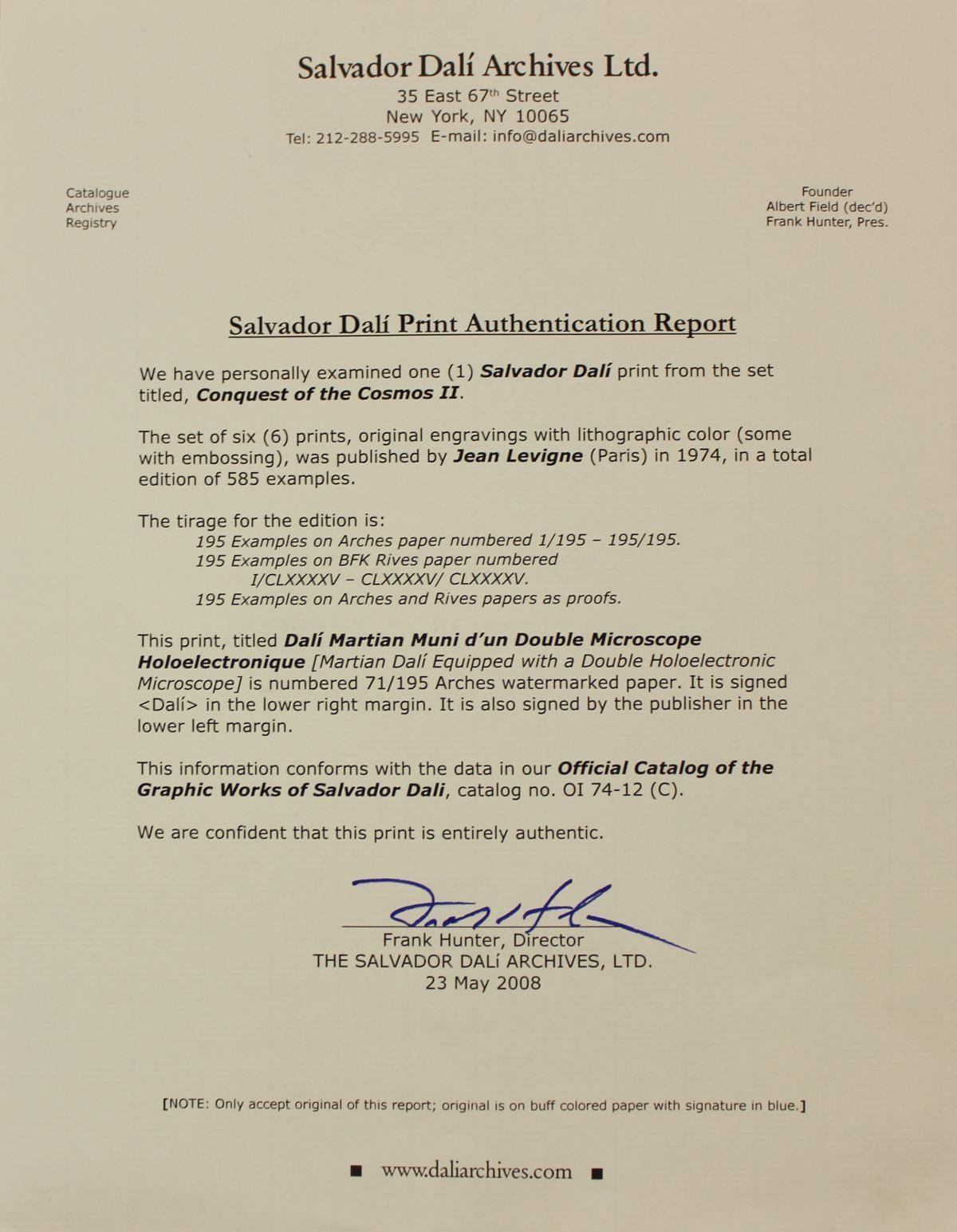 Artist: Salvador Dali. Medium: Original Engravings with Lithographic Color. Title: Dali Martian Muni Double Microscope Holoelectronique. Size (Unframed): 39" x 27.5". Certificate of Authenticity: From Frank Hunter. Reference# 10474.