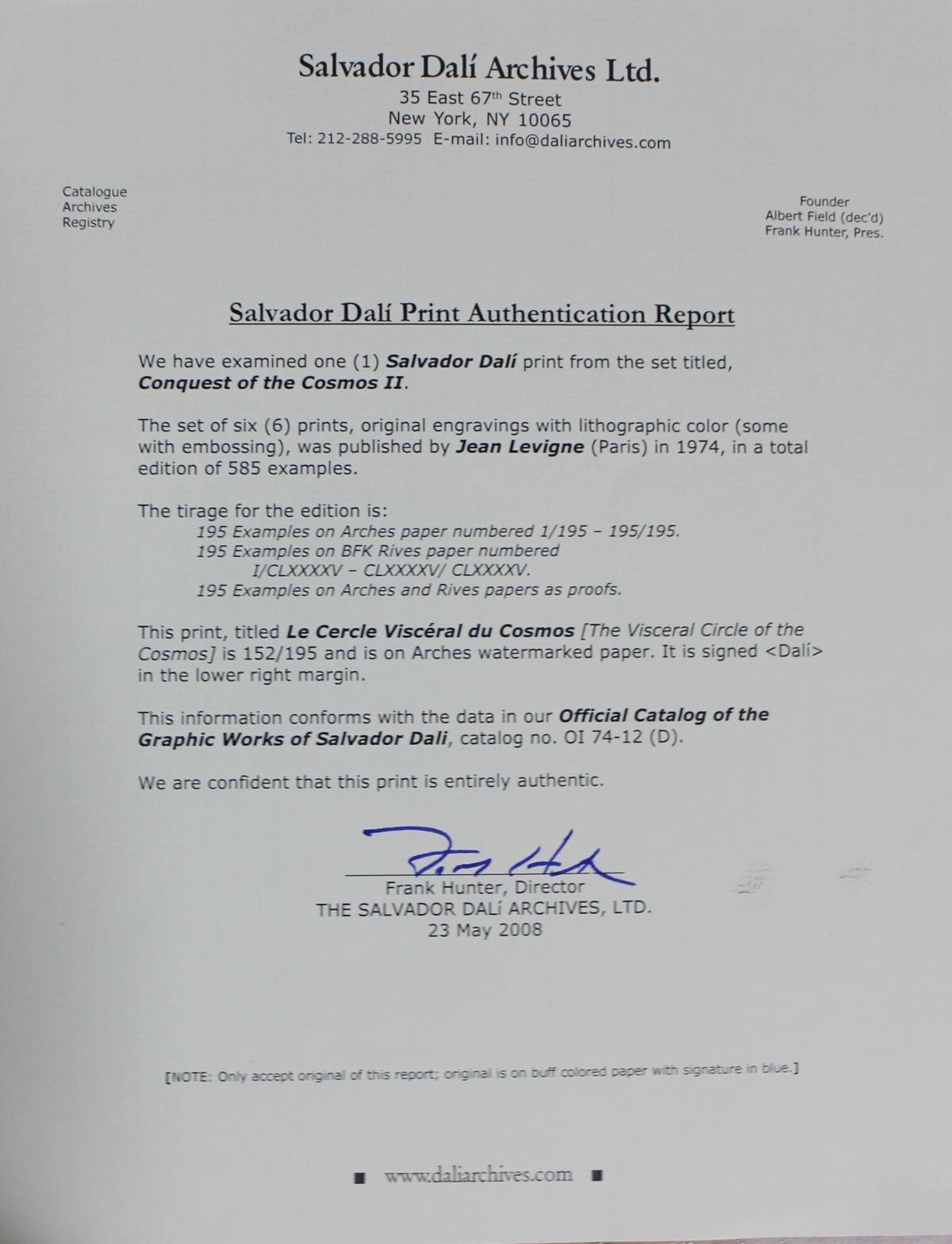Artist: Salvador Dali. Medium: Original Engravings with Lithographic Color. Title: The Visceral Circle of the Cosmos. Size (Unframed): 39" x 27.5". Certificate of Authenticity: From Frank Hunter. Reference# 10471.