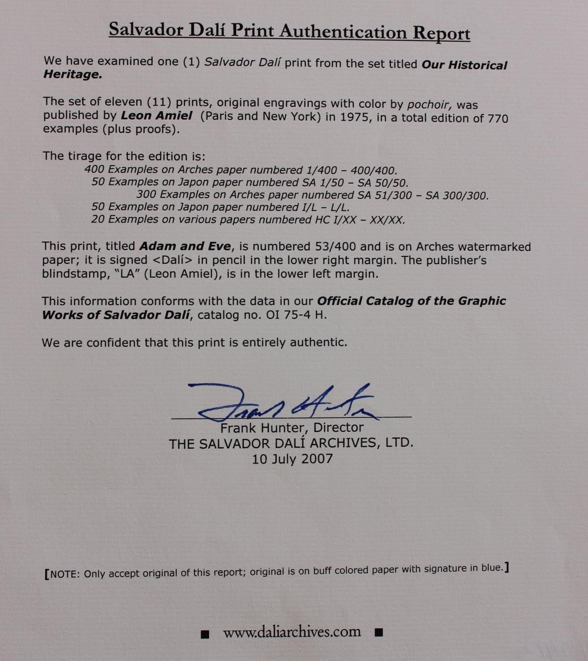 Artist: Salvador Dali. Medium: Original Engravings with color by pochoir. Title: Adam and Eve. Size (Unframed): 25.5" x 19.5". Certificate of Authenticity: From Frank Hunter. Reference# 10414.