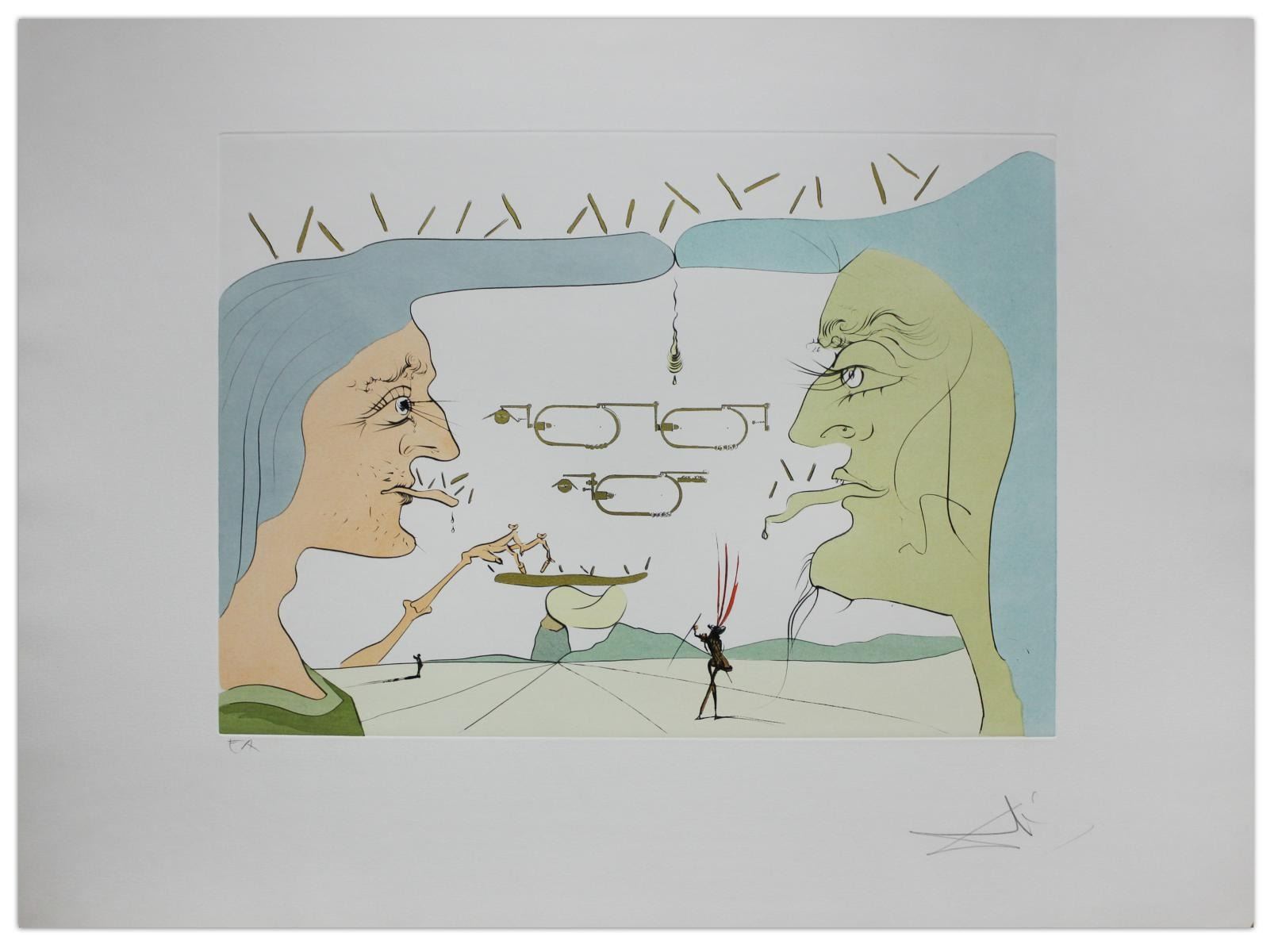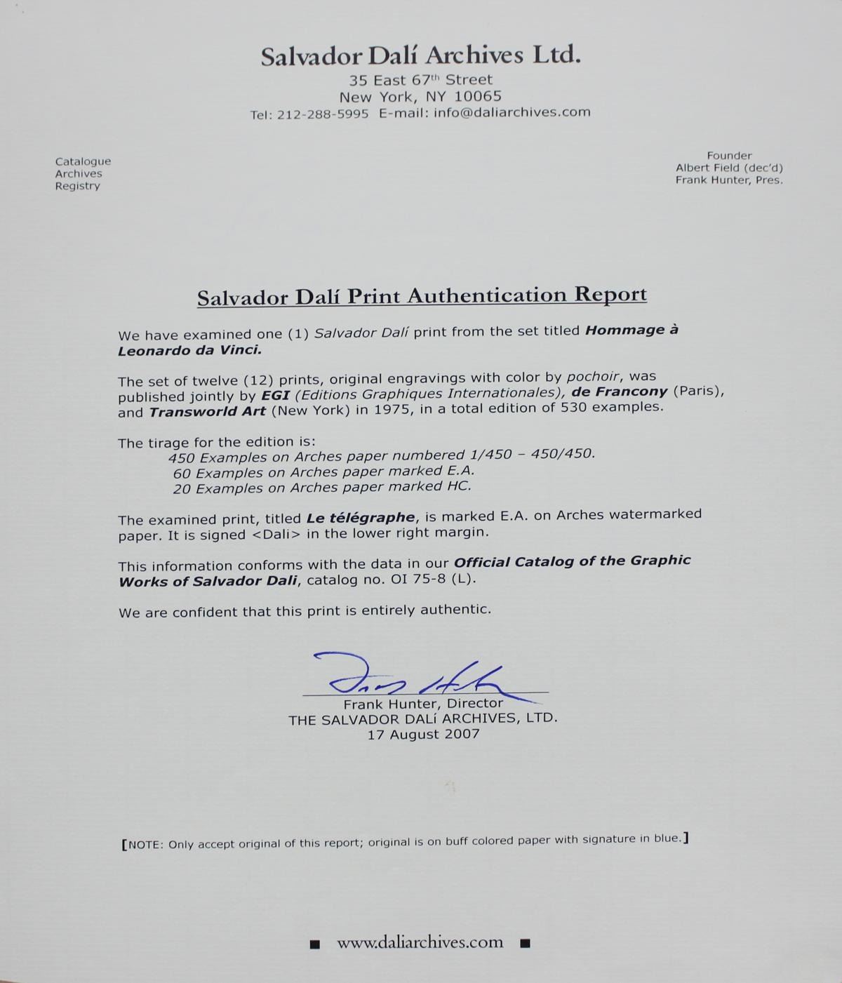 Artist: Salvador Dali. Medium: Original Engravings with color by pochoir. Title: Le telegraphe . Size (Unframed): 22" x 30". Certificate of Authenticity: From Frank Hunter. Reference# 15950.