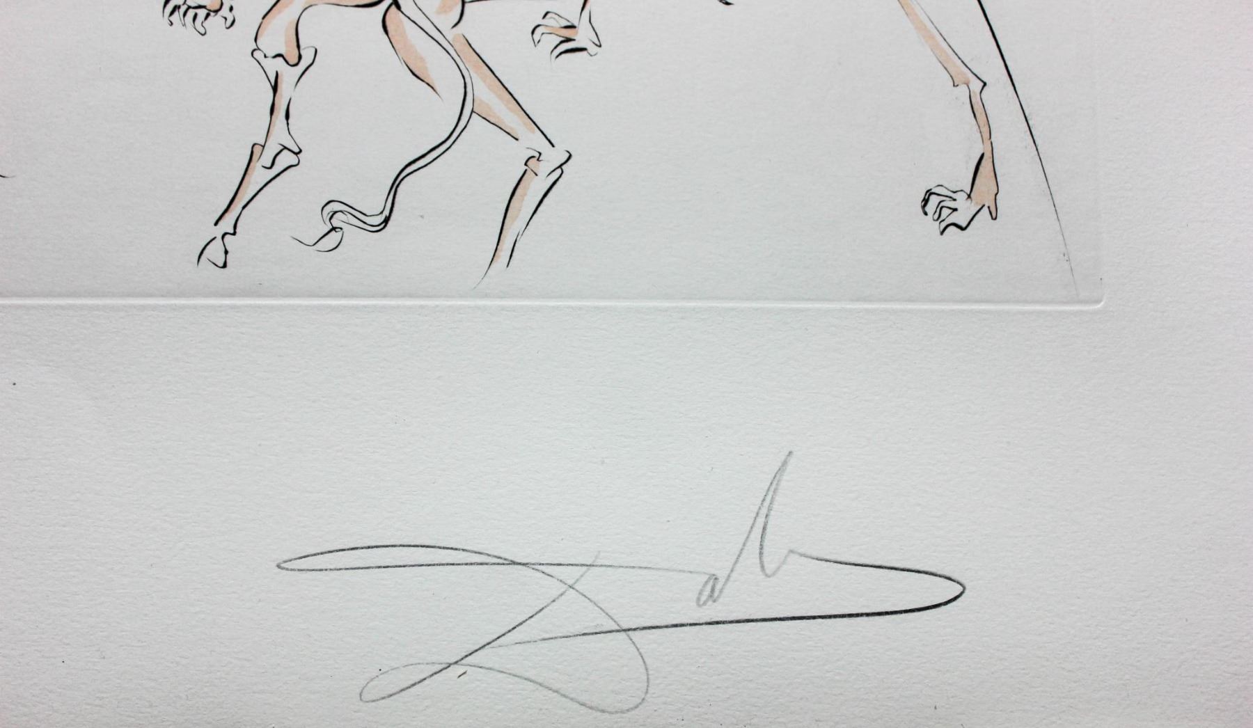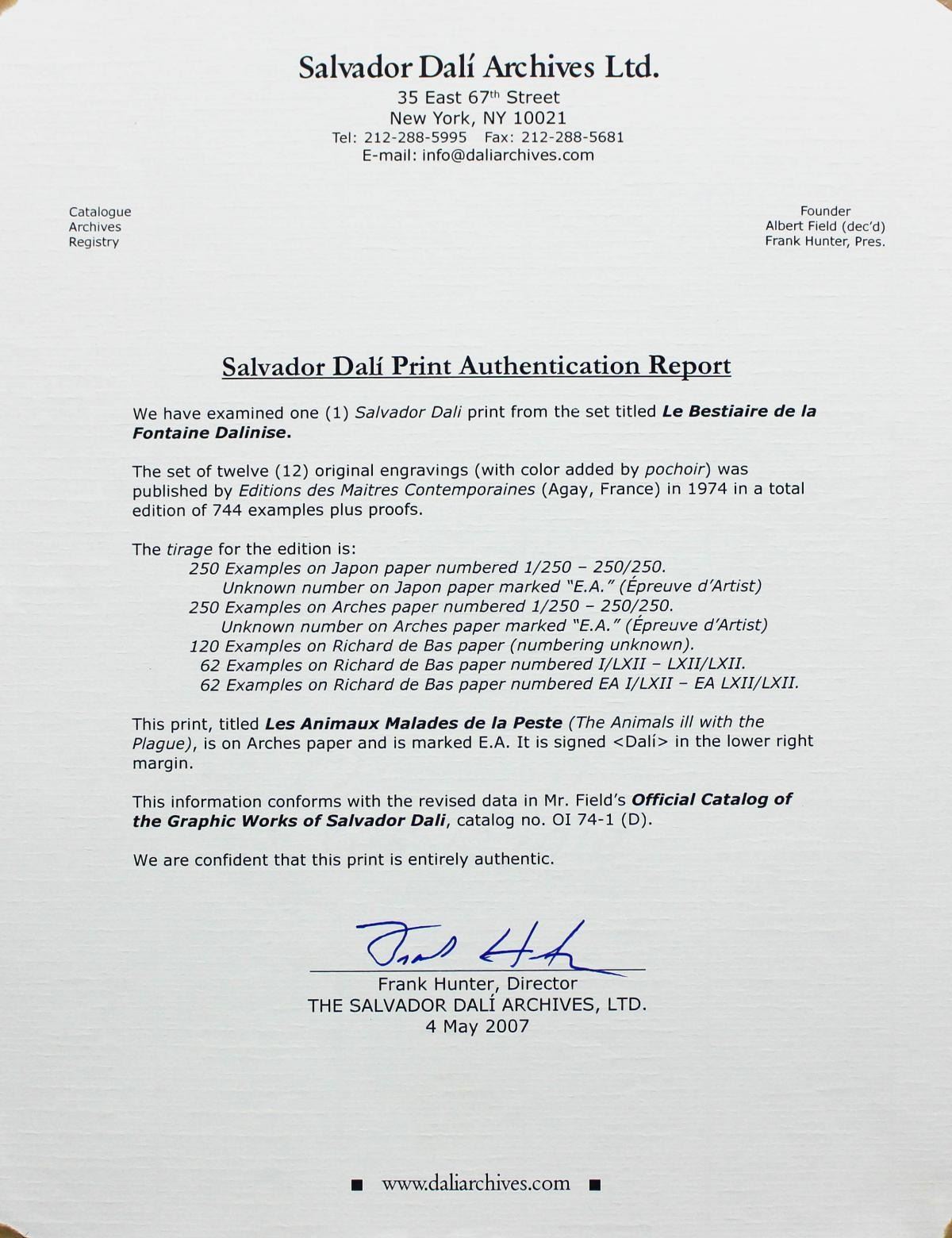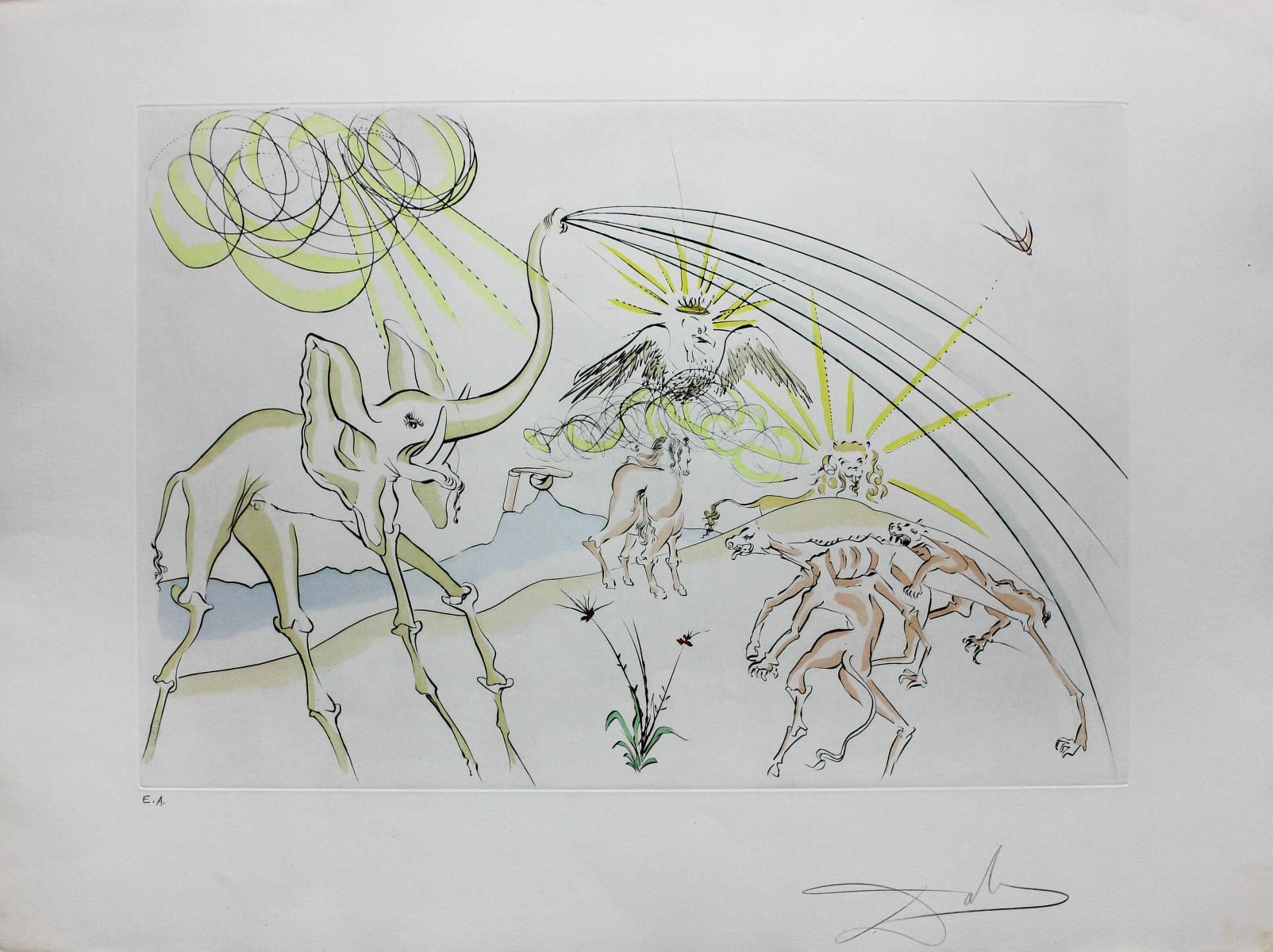 Artist: Salvador Dali. Medium: Original Engravings with color by pochoir. Title: The Animals ill with the Plague. Size (Unframed): 22" x 30". Certificate of Authenticity: From Frank Hunter. Reference# 13683.